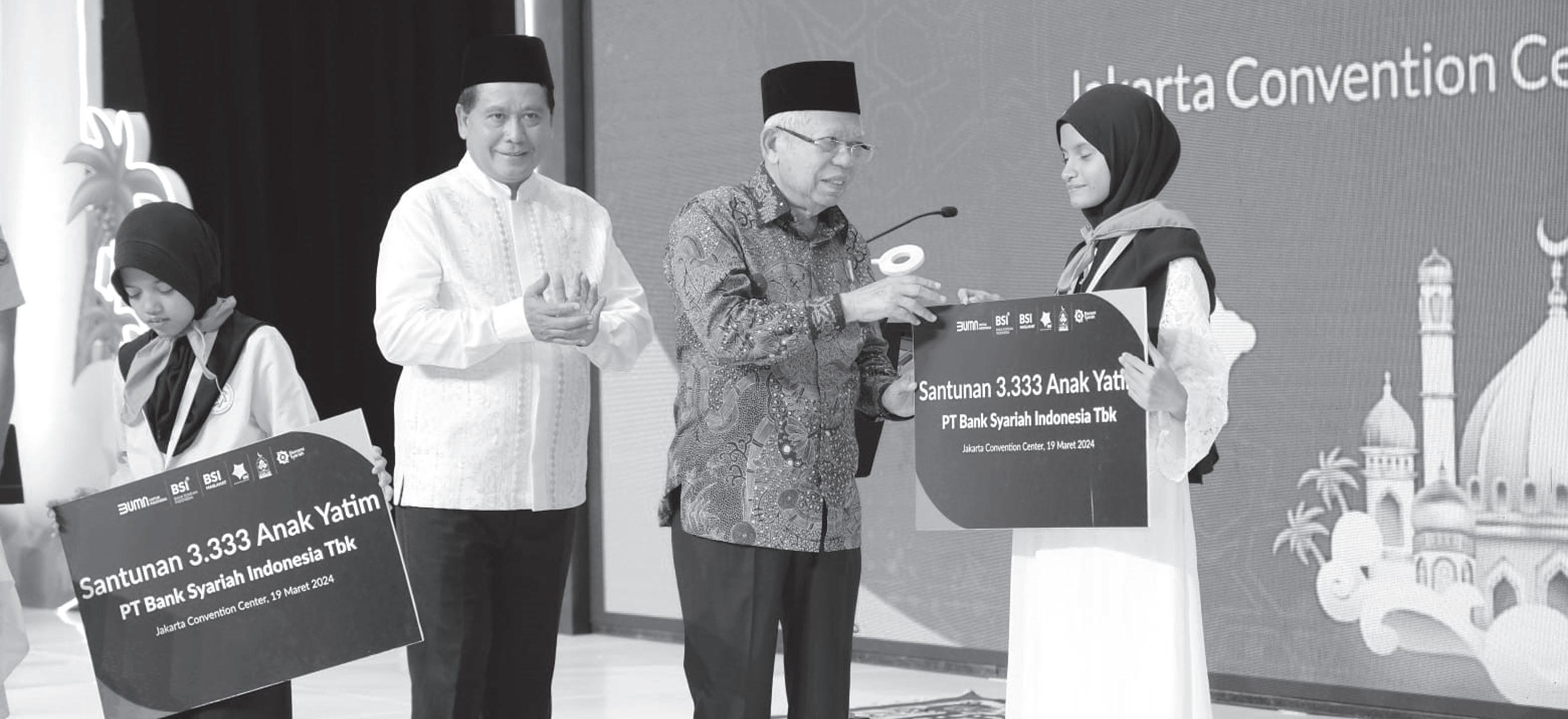 pada Selasa (19/3/2024), menghadiri dan menyerahkan secara simbolis Santunan 3.333 Anak Yatim Tahun 2024 didampingi Direktur Utama BSI Hery Gunardi (kiri kedua) di Assembly Hall Jakarta Convention Center, Jakarta. Jumlah penerima santunan ini selaras dengan milad ketiga BSI tahun ini, seperti perayaan milad sebelumnya yaitu