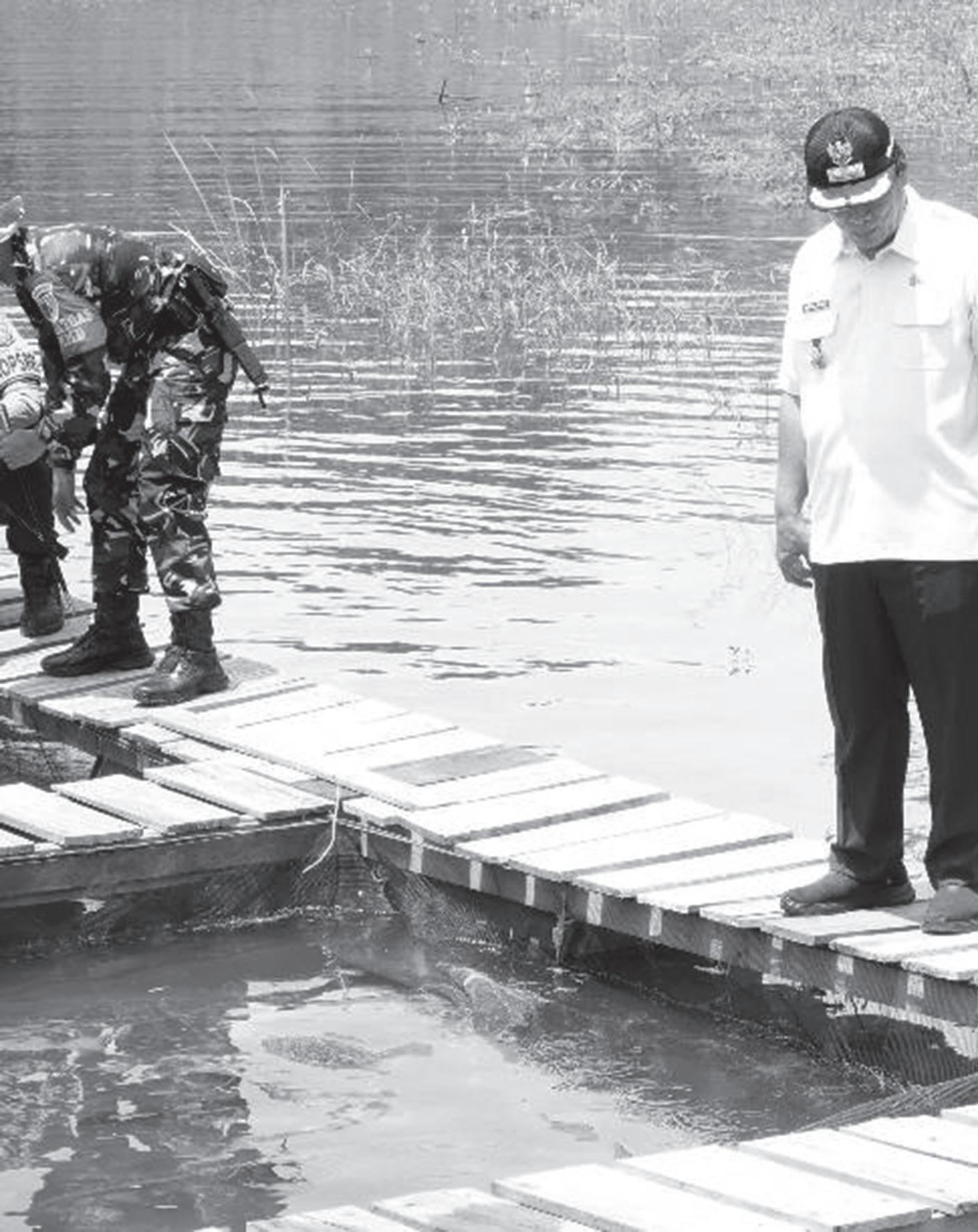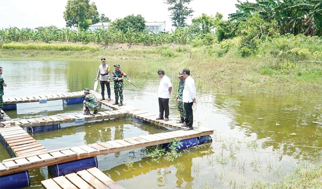 Bupati Lamongan Yuhronur Efendi beserta jajaran dan Dandim 0812 Lamongan Letkol Arm Ketut Wira Purbawan saat meninjau keramba apung di embung yang telah di normalisasi.