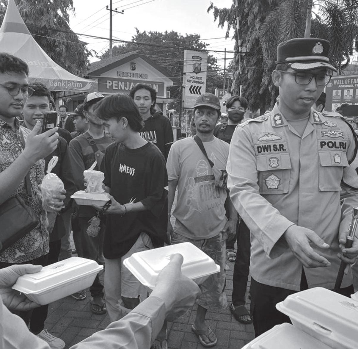 Kapolres Situbondo AKBP Dwi Sumrahadi Rakhmanto, membagikan takjil kepada massa pengunjuk rasa dari Aliansi Masyarakat Peduli Demokrasi (AMPD) Kabupaten Situbondo. Aliansi Masyarakat Peduli Demokrasi (AMPD) yang berorasi didepan Mapolres Situbondo mempertanyakan kebenaran informasi yang beredar di media sosial (medsos) bahwa Polri ikut cawe cawe pada Si Rekap dan juga Kantor Polisi sebagai tempat untuk rekapitulasi Si Rekap.