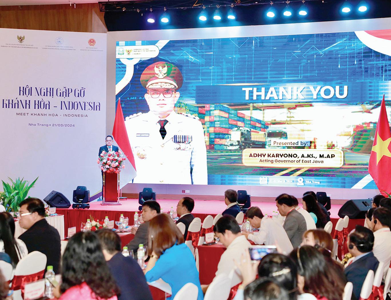 Penjabat (Pj) Gubernur Jatim Adhy Karyono, melakukan presentasi khusus di konferensi “Meet Khanh Hoa-Indonesia” di Vinh Ngoc Ballroom, Muong Thanh Luxury Hotel, Vietnam, pada Kamis (21/3).