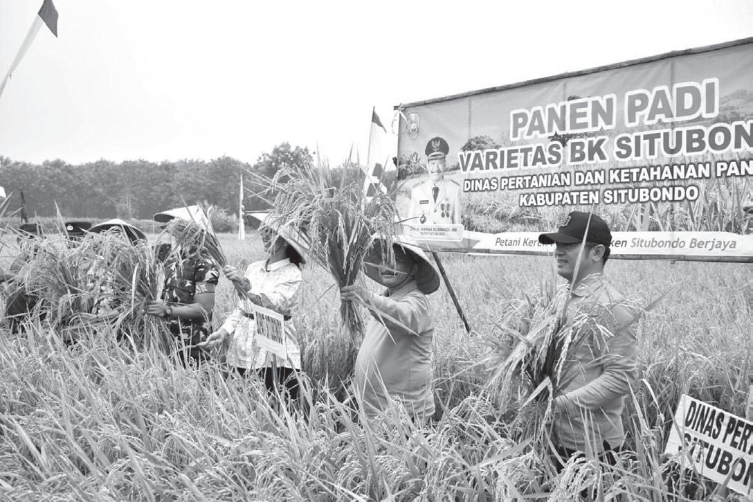 Bupati Situbondo, Karna Suswandi bersama Kadispertangan Dadang Aries Bintoro serta Kabid Penyuluhan Moh Zaini melakukan panen padi jenis BK 01 Agritan, Kamis (21/3). Acara tersebut berlangsung di lahan persawahan Harapan Makmur, Desa Lamongan, Kecamatan Arjasa, Kabupaten Situbondo. Bupati Karna mengatakan, padi BK 01 Agritan tersebut dipanen pada usia 77 hari paska tanam. Sehingga padi tersebut usianya sangat genja, bila dibandingkan dengan jenis padi hibrida pada umumnya. "Kami patut bersyukur karena hasil ubinan tadi setelah ditimbang mencapai 5,3 kilogram. Sehingga dalam satu hektarnya kurang lebih bisa menghasilkan 8,48 ton," ungkap Bupati Karna Suswandi.