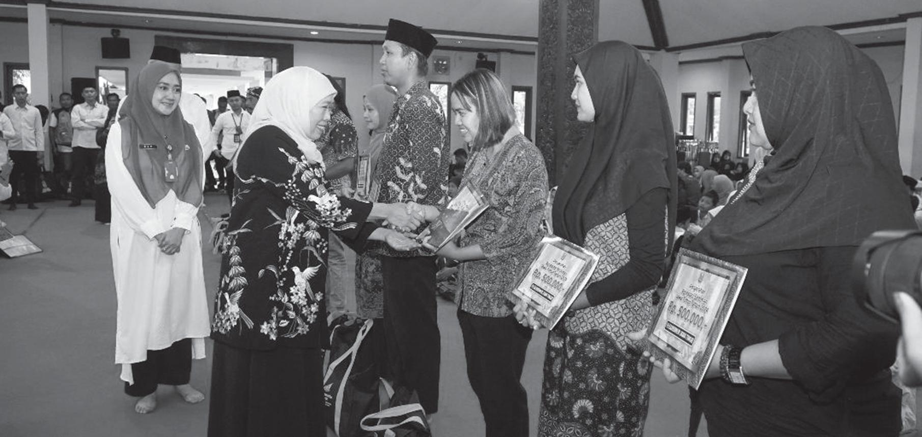 Gubernur Jawa Timur periode 20192024 Khofifah Indar Parawansa menyampaikan tausiahnya kepada seluruh penerima bantuan.