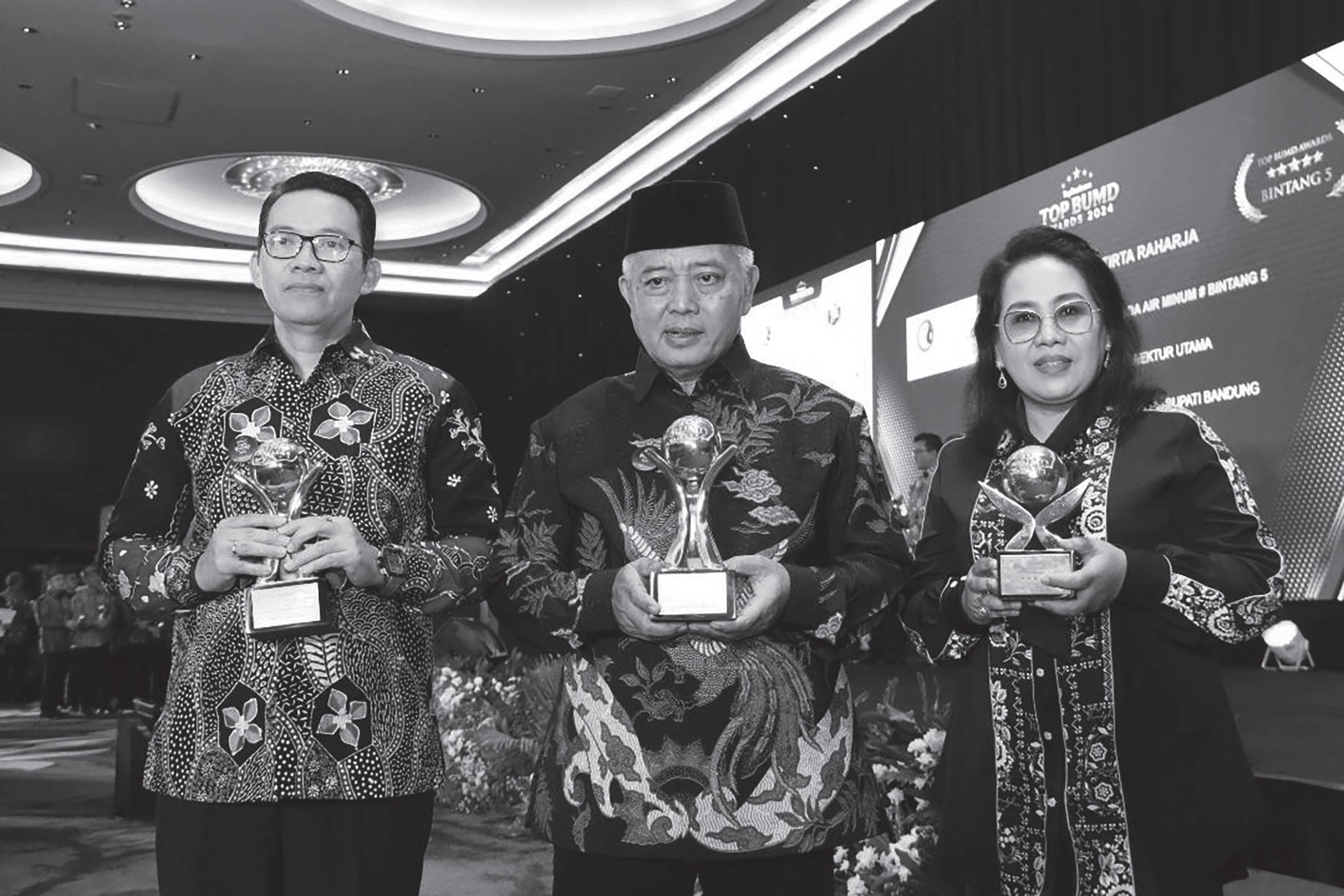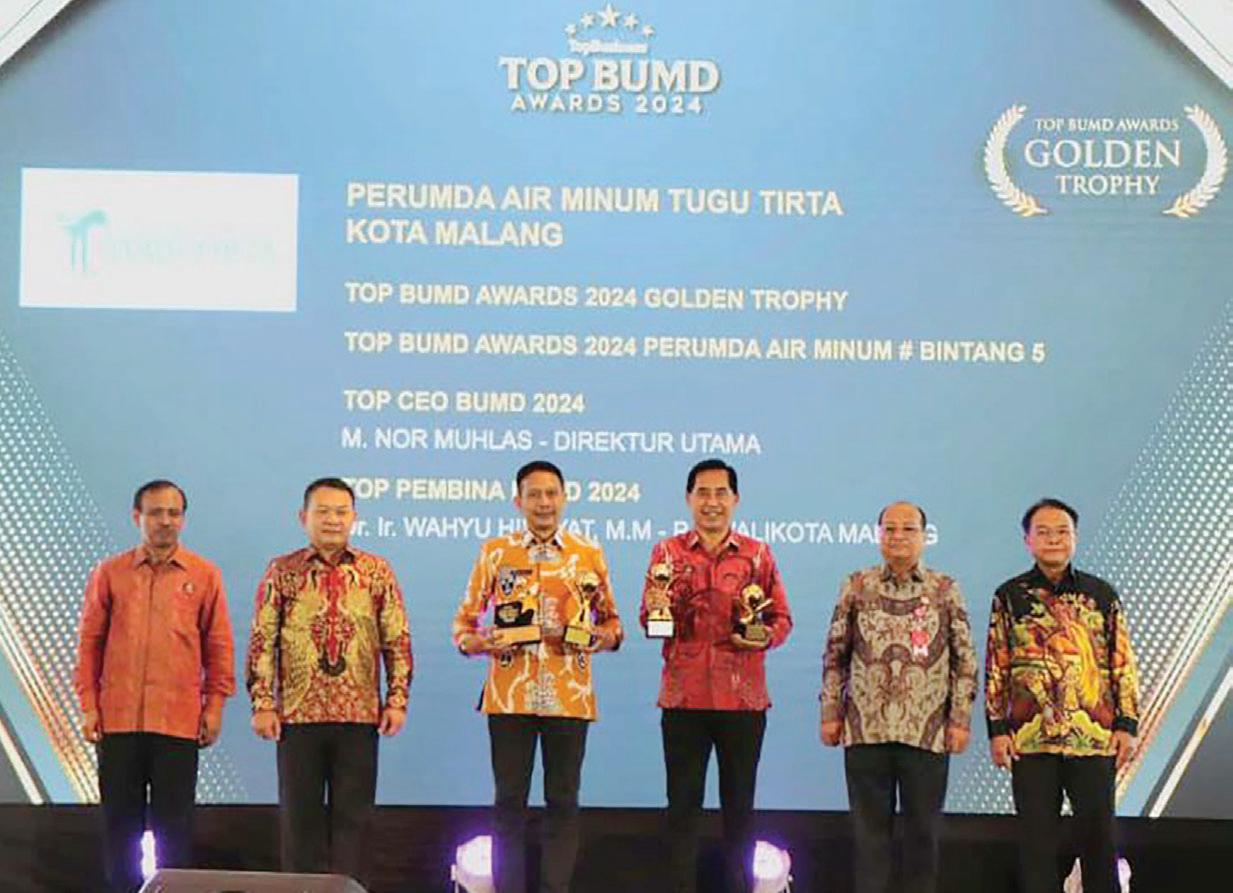 TuguTirta dinobatkan sebagai salah satu BUMD terbaik di Indonesia, ini untuk kali keempat secara beruntun, Perumda Tugu Tirta berjaya di ajang TOP BUMD Awards. Tak hanya berhak menerima trofi TOP Bintang 5, Perumda Tugu Tirta juga diganjar TOP BUMD GOLDEN Trophy 2024. Penghargaan khusus tersebut diberikan kepada instansi yang mampu meraih award selama tiga kali beruntun atau lebih dalam lima tahun terakhir. Puncak penghargaan bertajuk “Penguatan Tata Kelola dalam Membangun Kinerja Bisnis dan Layanan BUMD” digelar di Hotel Raffles Jakarta, Rabu (20/3) malam. Trofi diterima langsung oleh Pj Walikota Malang, Dr Ir Wahyu Hi-