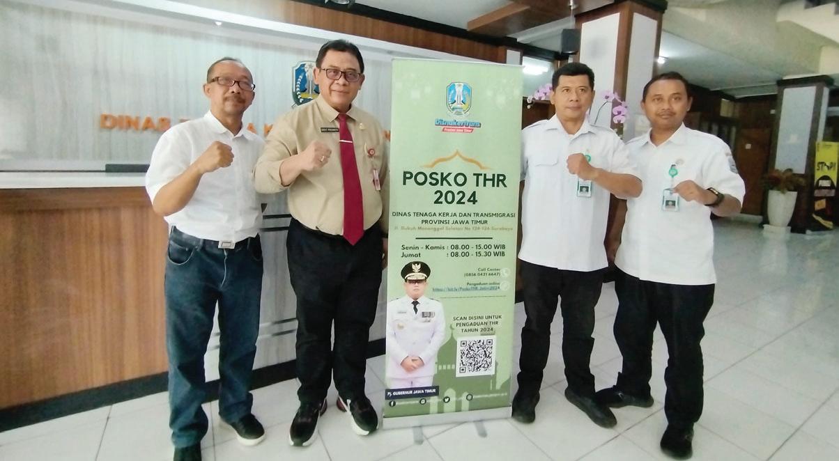 jumlah masa kerja dibagi 12 (dua belas) bulan dikali satu bulan upah. Sedangkan pekerja/buruh yang memiliki masa kerja 12 bulan ke atas mendapat THR sebesar satu bulan upah. Adapun pekerja/buruh yang bekerja berdasarkan perjanjian kerja harian, besaran THR-nya dihitung tersendiri. Pemberian THR Keagamaan ini, lanjut Sigit, untuk menciptakan suasana hubungan industrial yang kondusif. Dan pemberian THR keagamaan ini diperkuat dengan Surat Edaran Menteri Ketenagakerjaan Nomor M/2/HK.04/III/2024 tanggal 15 Maret 2024 tentang Pelaksanaan Pemberian Tunjangan Hari Raya Keagamaan Tahun 2024 Bagi Pekerja/ Buruh Di Perusahaan. Edaran ini ditindaklanjuti oleh Surat Edaran Gubernur Jawa Timur Nomor 560/ 11609/012/2024 tanggal 26 Maret 2024 tentang Tunjangan Hari Raya Keagamaan Tahun 2024, yang ditujukan kepada Jatim2024 atau melalui platform media sosial WhatsApp 085604216647. Sigit juga memaparkan, ada catatan jika melakukan pengaduan melalui online, yaitu tetap membuat pengaduan tertulis dengan kelengkapan berupa identitas pengadu: nama lengkap, alamat lengkap sesuai KTP, alamat lengkap korespondensi, no HP aktif, alamat email aktif, kartu identitas pribadi (KTP), kartu identitas kerja. Dilengkapi juga Identitas perusahaan yang diadukan: nama lengkap perusahaan, alamat lengkap perusahaan, bidang kerja perusahaan, no telp/HP aktif perusahaan, alamat email perusahaan, nama contact person/HRD perusahaan dan no telp/HP. Kemudian Isi pengaduan berupa kronologi permasalahan yang diadukan, poin permasalahan yang diadukan. Selanjutnya, bukti-bukti pengaduan: perjanjian kerja/SK pengangkatan kerja, slip gaji, kartu BPJS, absensi, ID card kerja, dan bukti lain yang terkait. Bagi pihak-pihak yang ingin membuat pengaduan dapat mengakses dan mengisi formulir pengaduan yang telah disediakan pada kanal-kanal tersebut. Sebagaimana diketahui, THR Keagamaan merupakan pendapatan non upah yang wajib dibayarkan oleh pengusaha kepada pekerja/ buruh menjelang Hari Raya Keagamaan. Baik itu pekerja/buruh dengan status pekerja tetap (PKWTT), maupun status pekerja kontrak (PKWT) sebagaimana ketentuan yang diatur pada Pasal 9 ayat (1) Peraturan Pemerintah Nomor 36 Tahun 2021 tentang Pengupahan, serta Peraturan Menteri Ketenagakerjaan RI Nomor 6 Tahun 2016 tentang Tunjangan Hari Raya Keagamaan Bagi Pekerja/Buruh di Perusahaan. Disisi lain, Sigit juga menyampaikan, saat ini ada sekitar 25 perusahaan yang sudah membayarkan terlebih dulu sebelum H-7. “Jumlah ini masih terus bertambah tentunya. Perusahaan seperti inilah patut mendapatkan apresiasi tersendiri karena berusaha memberikan kewajibannya sebelum waktu yang ditentukan,” pungkasnya. [rac] Pemprov Jatim Buka 53 Posko Pelayanan THR Keagamaan Tahun 2024 Ada 53 titik posko pelayanan THR Keagamaan yang dipersiapkan Disnakertrans Prov Jatim, yaitu berupa 1 posko induk di Kantor Disnakertrans Prov Jatim yang berada di Jalan Dukuh Menanggal 124-126 Surabaya. Kemudian Posko Pengaduan THR juga ada di 14 UPT BLK Disnakertrans Prov Jatim. Ke 14 UPT BLK itu berada di Sumenep, Jember, Singosari, Kediri, Tulungagung, Mojokerto, Jombang, Nganjuk, Madiun, Ponorogo, Bojonegoro, Tuban, Pasuruan, Situbondo. Dan Posko Pelayanan THR Keagamaan juga ada di kantor Instansi yang membidangi ketenagakerjaan di 38 Kabupaten/Kota. Posko THR Keagamaan Jawa Timur Tahun 2024 melayani mulai tanggal 22 Maret 2024 sampai dengan 5 April 2024 pada setiap hari kerja mulai pukul 08.00 - 15.00 WIB (Senin sampai dengan Kamis), dan pukul 08.00 - 15.30 WIB (Jum’at). Pembentukan posko aduan THR ini, sesuai dengan arahan Menteri Ketenagakerjaan RI agar Gubernur dan Bupati/ Walikota untuk membentuk Pos Komando Satuan Tugas (Posko Satgas) Ketenagakerjaan Pelayanan Konsultasi dan Penegakan Hukum Tunjangan Hari Raya Tahun 2023 di wilayah masing-masing; Selain membentuk Posko Satgas, perlu menegakkan hukum