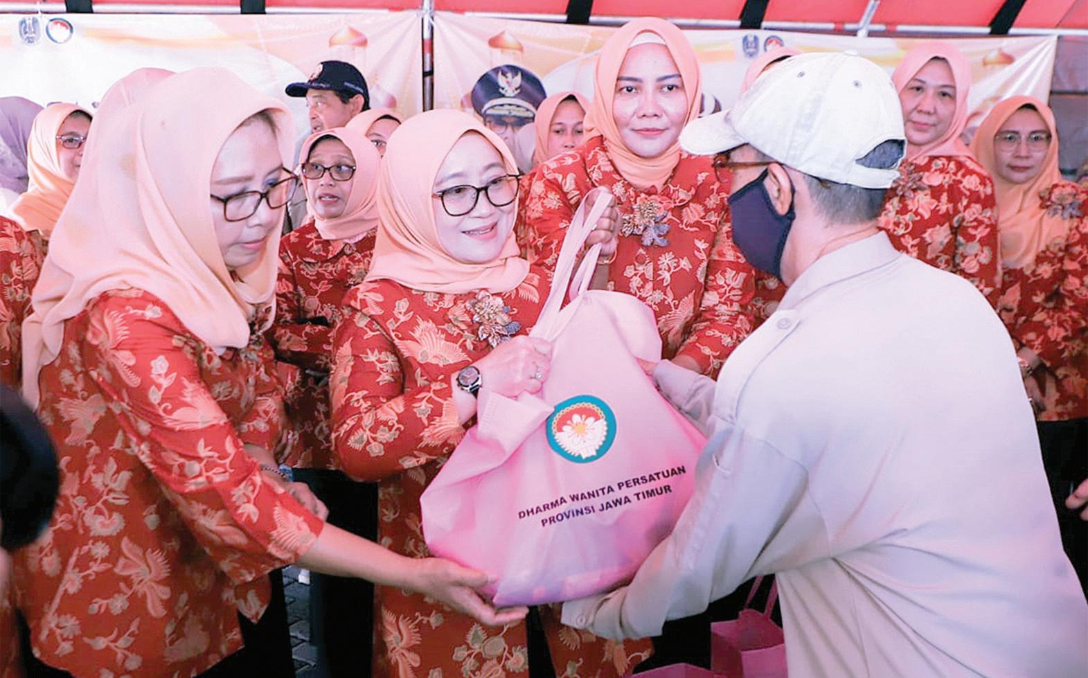 Ketua DWP Provinsi Jatim Isye Sri Rahayu Adhy Karyono saat menyerahkan sembako kepada warga kurang mampu yang tinggal di lingkungan Kantor Gubernur Jatim.