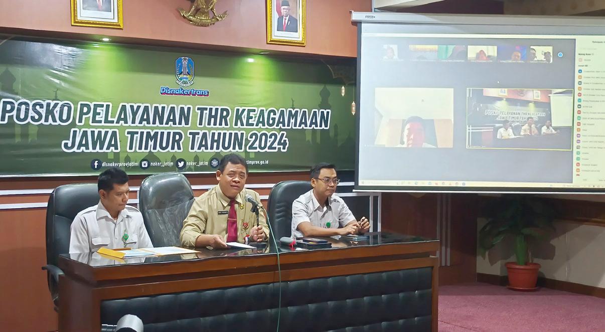 (THR) Keagamaan Tahun 2024, dengan memperhatikan rekomendasi dari hasil pemeriksaan Pengawasan Ketenagakerjaan; Dan melaporkan data pelaksanaan Tunjangan Hari Raya (THR) Keagamaan tahun 2024 di perusahaan serta tindak lanjut yang telah dilakukan, kepada Kementerian Ketenagakerjaan melalui website https://poskothr.kemnaker.go.id. Kepala Disnakertrans Prov Jawa Timur Sigit Priyanto, S.T., MM. menegaskan, Pemerintah Provinsi Jawa Timur tetap melakukan pengawasan terhadap pelaksanaan pembayaran THR Keagamaan Tahun 2024, sehingga lebih efektif, efisien, penuh inovasi juga bisa diimplementasikan. “Tahun lalu ada 51 laporan masuk ke Posko THR Keagamaan, terdiri dari 12 konsultasi dan 39 pengaduan. Untuk tahun ini, kami berharap angka itu semakin menurun atau dengan kata lain, lebih bayak perusahaan memiliki kesadaran akan kewajiban membayarkan THR kepada karyawannya,” tandasnya. Ia menjelaskan, THR Keagamaan dibayarkan paling lambat 7 hari sebelum Hari Raya Keagamaan kepada pekerja/buruh yang mempunyai hubungan kerja dengan pengusaha berdasarkan perjanjian kerja waktu tidak tertentu atau perjanjian kerja waktu tertentu. Pekerja/buruh yang mempunyai