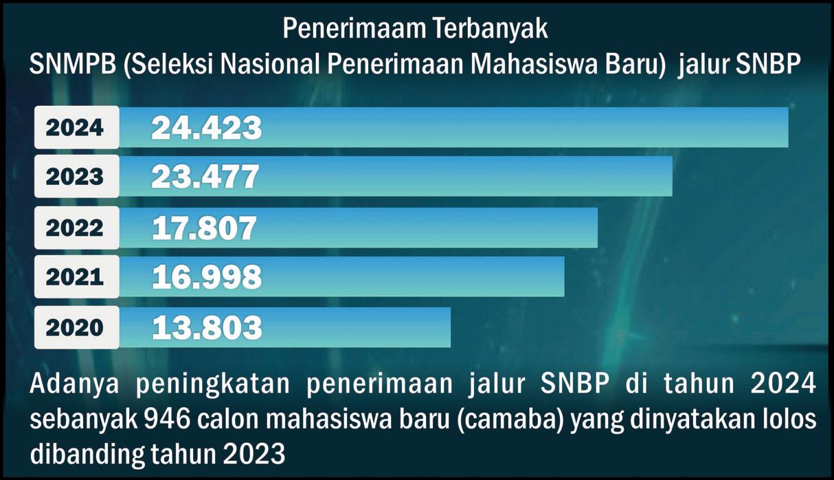 Rincianya sebanyak 20.237 siswa diterima di PTN Akademik dari 90.292 pendaftar dan 4.186 siswa diterima di PTN Vokasi dari 10.689 pendaftar. Dengan ini maka selama lima tahun berturut-turut sejak tahun 2020, Jawa Timur berhasil mempertahankan predikat tersebut. Merujuk data tersebut, Jatim menempati peringkat pertama dengan penerimaan terbanyak SNBP tahun 2024. Capaian ini sekaligus mengantarkan Jatim sebagai provinsi yang konsisten mengantarkan siswanya masuk PTN berdasarkan jalur prestasi sejak tahun 2020 lalu. Atas capaian tersebut, Penjabat (Pj) Gubernur Jatim Adhy Karyono secara khusus mengapresiasi dedikasi
