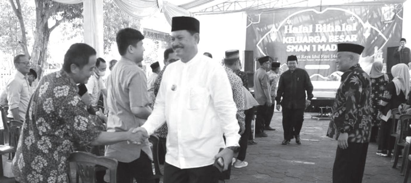 Pemkot Madiun, Bhirawa Hari pertama masuk kerja setelah libur Lebaran dimanfaatkan oleh jajaran Pemerintah Kota Madiun untuk menggelar halal bihalal bersama Forkopimda di halaman depan Balai Kota Madiun, Selasa (16/4/2024). Acara diawali dengan sambutan dari Wali Kota Madiun, Dr. Maidi. Kemudian, dilanjutkan tausiyah dari Ketua MUI Kota Madiun KH. Sutoyo. Selanjutnya, seluruh tamu undangan berjabat tangan secara bergantian. “Hari ini pertama masuk kerja kita manfaatkan untuk halal bihalal. Semua datang. Forkopimda, eksekutif, dan legislatif,” kata Wali Kota, Selasa (16/4/2024). Orang nomor satu di Kota Pendekar itupun berharap kegiatan ini bisa semakin meningkatkan sinergitas antara seluruh instansi di Kota Madiun. Sehingga, kondusivitas kota selalu terjaga. “Semoga hubungan yang sudah baik ini bisa terus terjalin dan bersama-sama membangun Kota Madiun,” tandasnya. Giat silaturahmi berbalut halal bihalal bersama Wali Kota Madiun, Dr. Maidi terus berlanjut. Setelah dengan beberapa alumni sekolah, kali ini Wali Kota berhalal-bihalal dengan masyarakat secara umum. Yakni dengan masyarakat Rt 19 Kelurahan Klegen Kecamatan Kartoharjo juga di Jalan Nusa Tenggara Gang Rukun, Senin (15/4/2024) malam.