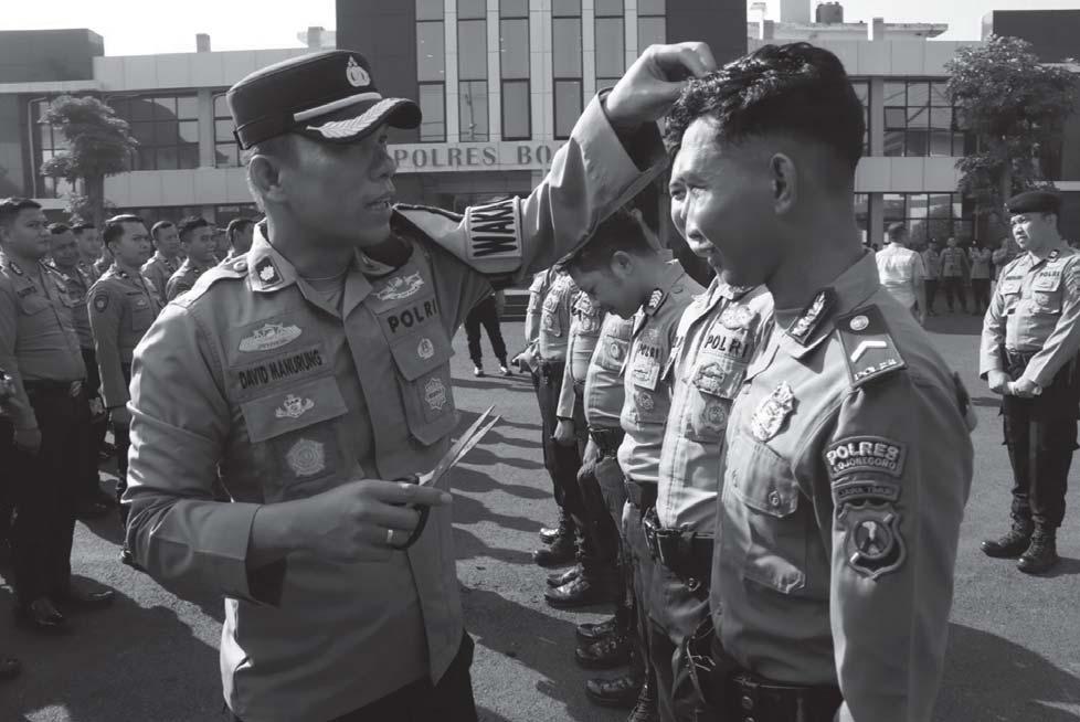kemarin (29/5). Dengan berbekal gunting, Wakapolres didampingi Unit Propam memeriksa rambut seluruh anggota Polri seusai mengikuti apel pagi. Beberapa anggota Polri rambutnya gondrong langsung dirapikan di tempat. Wakapolres, Kompol David Manurung mengatakan kegiatan Gaktibplin ini bertujuan pembinaan dan pencegahan untuk meminimalisir pelanggaran anggota. Lanjut David, Gaktibplin ini menyasar sikap tampang anggota seperti rambut, kumis serta pemeriksaan kelengkapan surat data diri, kebersihan dan kerapian seragam polisi (Gampol), kelengkapan surat senjata api.