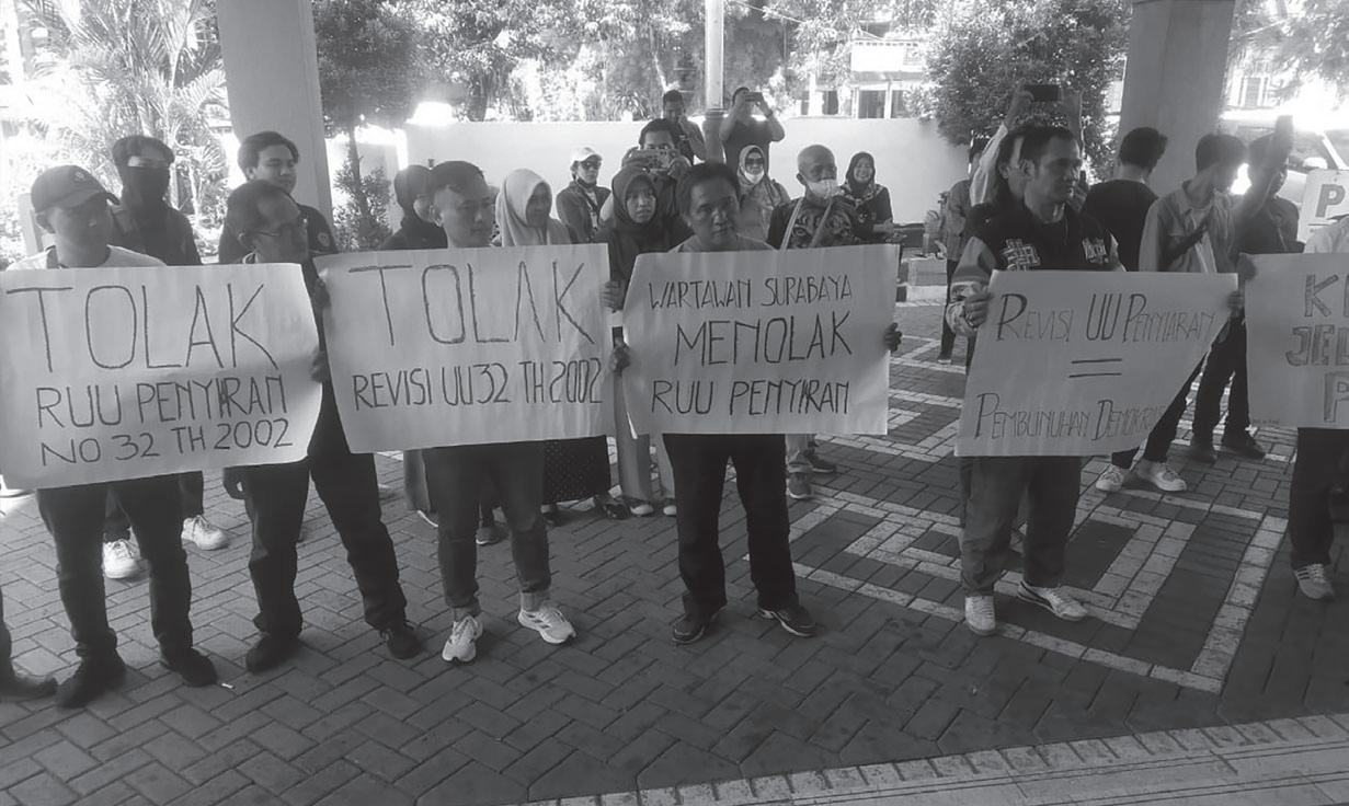 Aksi yang diikuti berbagai wartawan dari beragam kelompok kerja (Pokja ) seperti Pokja Jurnalis Dewan Surabaya (Judes), Pokja Taman Surya (Potas) termasuk dari organisasi wartawan Aliansi Wartawan Surabaya (AWS), Serikat Media Siber Indonesia (SMSI) Surabaya, Kelompok-kelompok Pers Mahasiwa dan sejumlah elemen lainya tersebut menolak RUU Penyiaran yang memuat pasal-pasal yang mengancam kebebasan pers. Selain itu menuntut pembatalan pasal yang merugikan kerja-kerja pers dalam menyampaikan informasi ke publik. Terlebih, pembahasan draft RUU Penyiaran sebagaimana pernyataan Dewan Pers tidak melibatkan organisasi wartawan. Maulana salah satu Koordinator Aksi lainya mengatakan, menjadi persoalan serius ketika pers didengungkan sebagai salah satu pilar demokra-