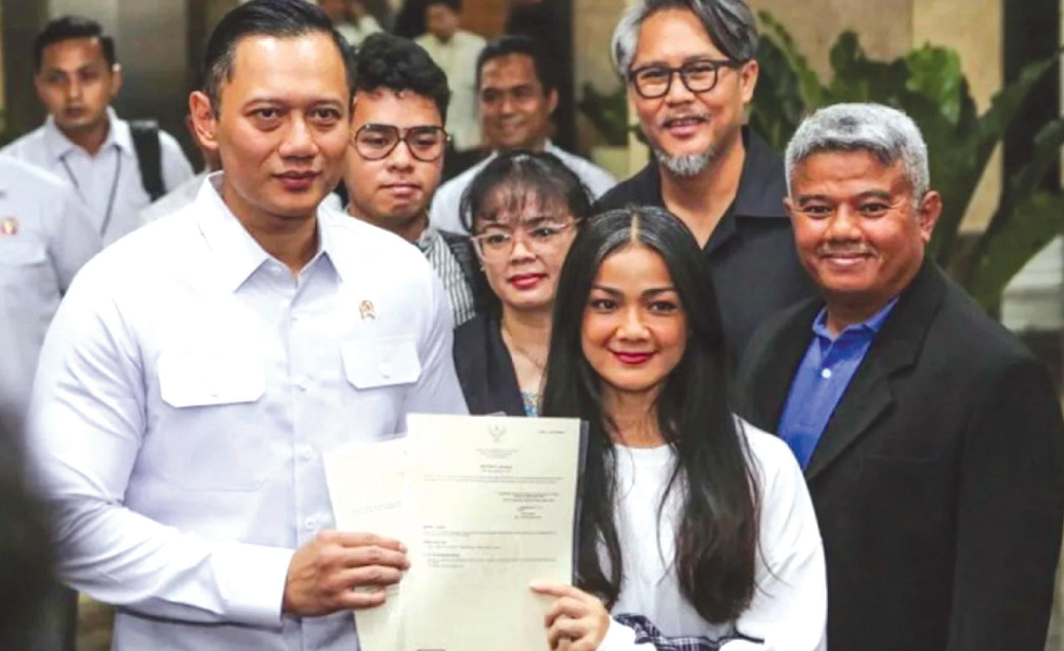 Menteri Agraria dan Tata Ruang/Kepala Badan Pertanahan Negara (ATR/BPN) Agus Harimurti Yudhoyono (kiri) menyerahkan sertifikat tanah kepada artis Nirina Zubir (tengah) di Kantor ATR/BPN, Jakarta, Rabu (29/5/ 2024). Kementerian ATR/BPN menyerahkan sertifikat milik keluarga Nirina Zubir setelah kasus sengketa tanah yang sertifikatnya sempat digelapkan oleh mantan asisten rumah tangganya sejak tahun 2018. antara foto