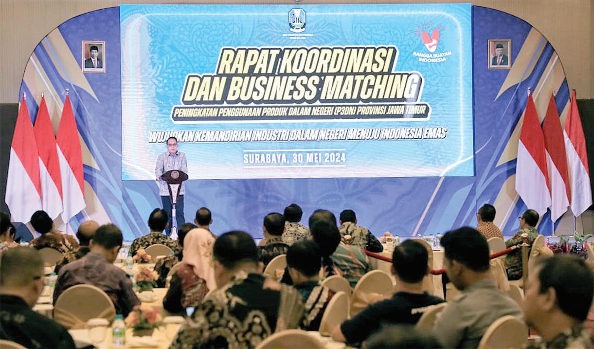 Jatim Adhy Karyono membuka Rapat Koordinasi dan Business Matching Peningkatan Penggunaan Produk Dalam Negeri (P3DN) Provinsi Jatim Tahun 2024 di Dyandra Convention Center Surabaya.