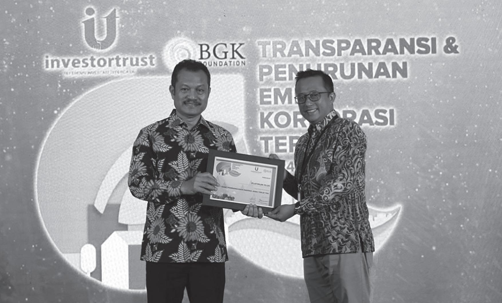 Investortrust.id dan Bumi Global Karbon (BGK) Foundation telah memberikan penghargaan kepada PT Bank Pembangungan Daerah Jawa Timur (bankjatim) karena kesuksesanya di ajang Transparansi dan Penurunan Emisi Korporasi Terbaik 2024, dalam hal Transparansi Perhitungan Emisi Korporasi Terbaik 2024 kategori Platinum Plus.