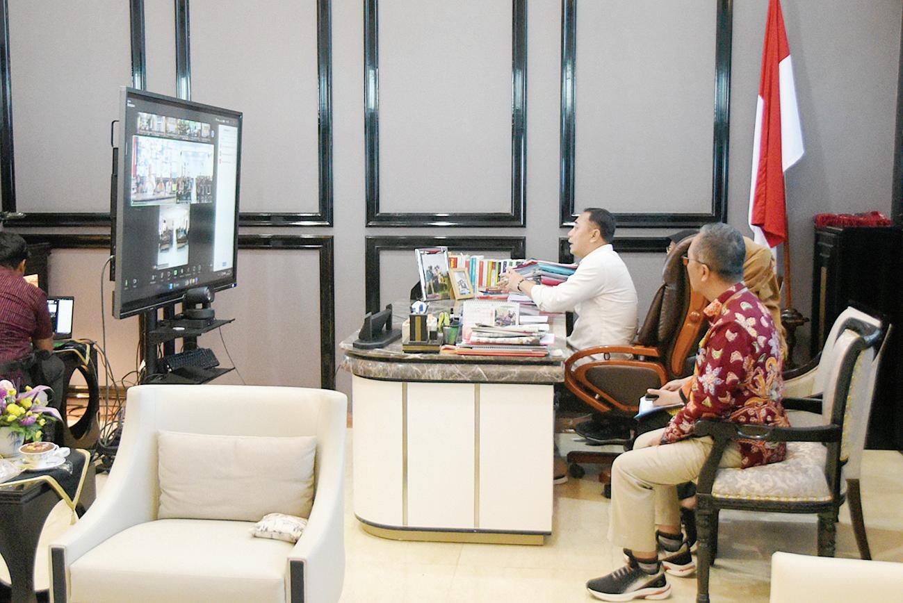 Wali Kota Surabaya Eri Cahyadi memberikan pengarahan kepada seluruh ASN di lingkungan Pemkot Surabaya, Kamis (30/5). Pengarahan yang dilakukan melalui zoom meeting dari ruang kerja Wali Kota Surabaya itu diikuti oleh seluruh ASN pemkot.