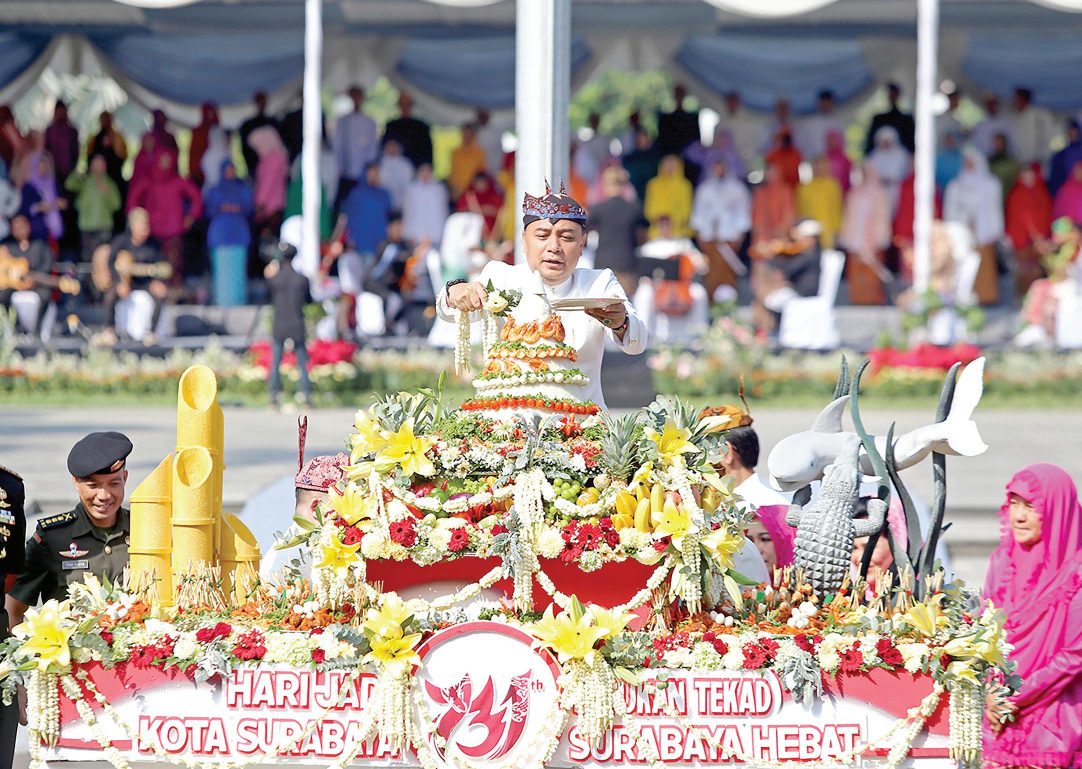 Resepsi upacara peringatan Hari Jadi Kota Surabaya (HJKS) ke-731 berjalan khidmat di Taman Surya Balai Kota Surabaya, Jumat (31/5/2024) pagi. Upacara ini disemarakkan pagelaran kolaborasi seni-budaya, penyerahan 272 piagam penghargaan, hingga launching Pos Bantuan Hukum serentak di 1.368 Balai RW Surabaya.