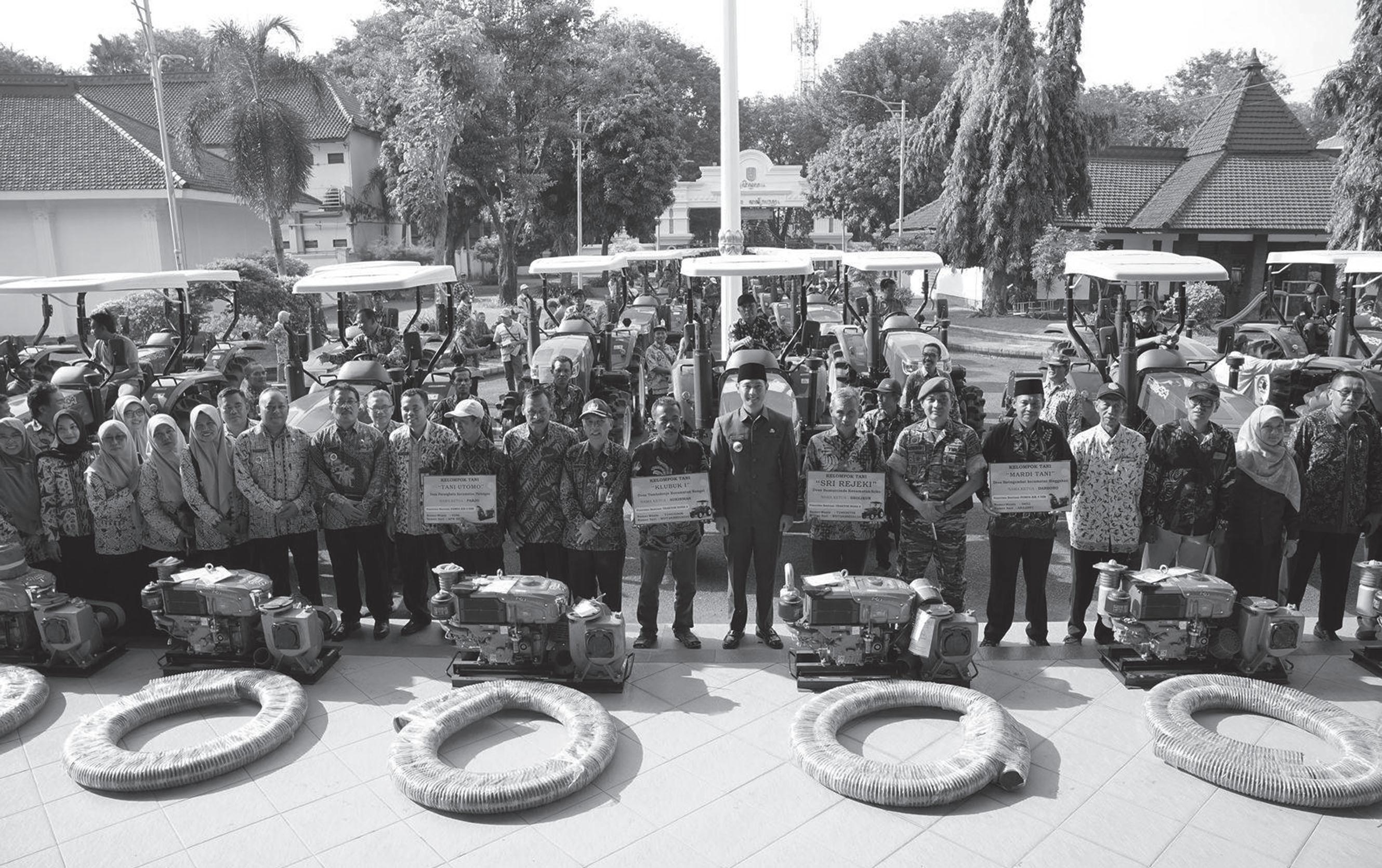 Bupati Tuban, Aditya Halindra Faridzky, SE., bersama Dandim 0811/Tuban, Letkol Inf Dicky Purwanto menyerahkan 40 unit traktor roda 4 dan 15 pompa air ukuran 4 dim kepada Kelompok Petani (Poktan) dari 20 kecamatan di Kabupaten Tuban, Jumat (31/6). Bertempat di Pendapa Kridha Manunggal, penyerahan alat mesin pertanian (Alsintan) ini dihadiri pula Sekda Kabupaten Tuban, Budi Wiyana, Kepala DKP2P Tuban, Eko Julianto, Camat dan Danramil, serta penyuluh pertanian.