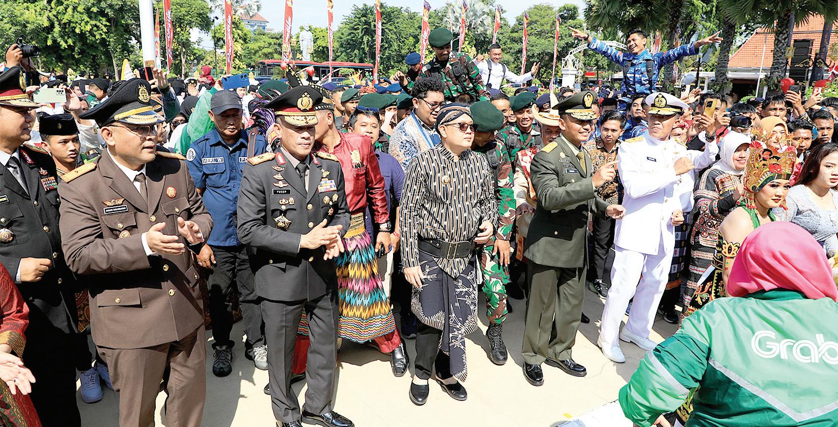 Pemprov, Bhirawa Hari Lahir Pancasila 2024 dengan tema “Pancasila Jiwa Pemersatu Bangsa Menuju Indonesia Emas 2045” menarik antusiasme ribuan masyarakat Jawa Timur. Mereka kompak mengenakan pakaian adat dari seluruh daerah di Indonesia dan berkumpul di halaman Gedung Negara Grahadi, Surabaya, Sabtu (1/6). Suasana nasionalisme kian terasa dengan hadirnya berbagai penampilan seperti tari Jejer Massal Gandrung Banyuwangi yang dipersembahkan oleh penari gabungan Daru Brang Wetan Comunity. Adapula penampilan penyanyi Jawa Timur Cak Shodiq dan Lala Widy yang diiringi dengan flash mob oleh seluruh peserta upacara. Penjabat (Pj) Gubernur Jawa Timur Adhy Karyono mengatakan, acara ini dipersembahkan untuk masyarakat. Menurutnya, ini adalah satu wujud implementasi Pancasila yang