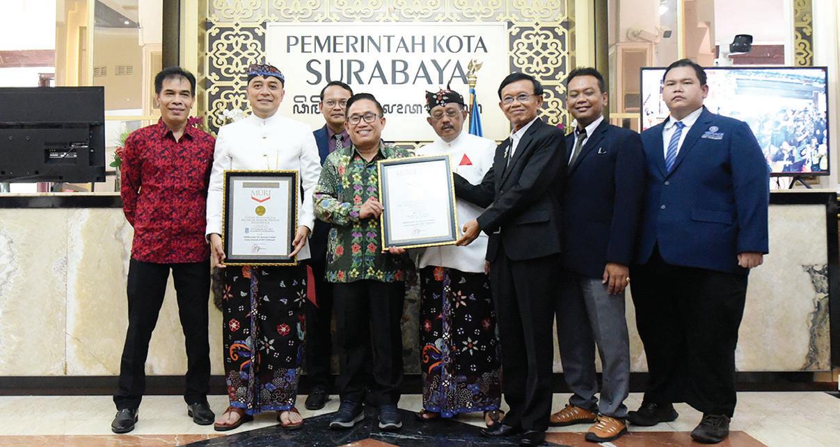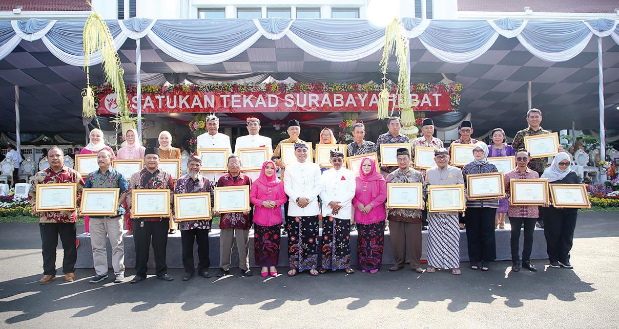 bagai pilar masyarakat yang bekerja keras mewujudkannya. “Surabaya Hebat dibangun tidak untuk hari ini. Tidak untuk tahun depan, tetapi untuk keberlanjutan menyongsong Indonesia Emas 2045,” kata Wali Kota Eri. Resepsi upacara ini juga menjadi momen spesial bagi Pemerintah Kota (Pemkot) Surabaya untuk memberikan 272 penghargaan kepada tokoh, pelajar, instansi maupun perusahaan yang telah berprestasi atau memberikan dedikasinya untuk Surabaya. Para penerima penghargaan itu di antaranya adalah pemain Timnas Indonesia, yaitu Rizky Ridho Ramadhani, Marselino Ferdinan dan Ernando Ari Sutaryadi. Penghargaan itu diserahterimakan