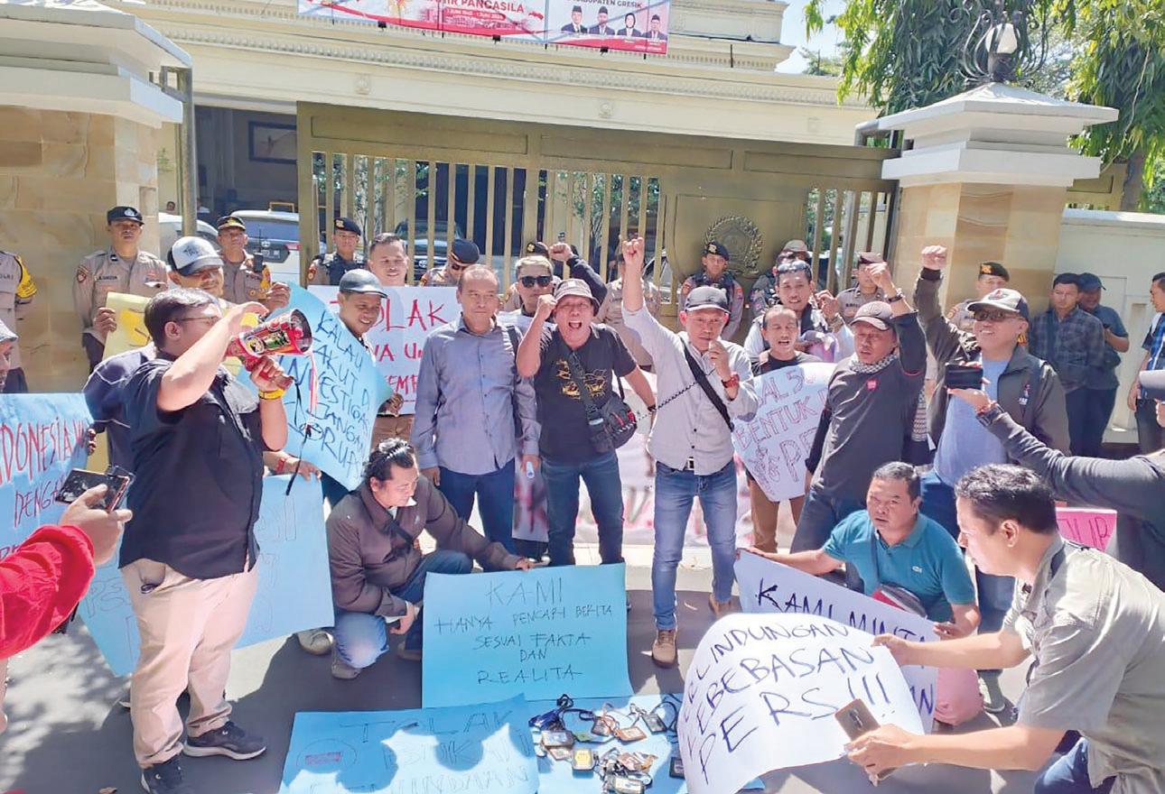lamatkan profesi jurnalis yang sedang terancam, perjuangan terhadap kemerdekaan pers bukanlah proses yang berhenti pada suatu titik, melainkan harus terus diperjuangkan dan dipertahankan. “Kami mendesak DPR RI, mengkaji ulang rencana revisi UU penyiaran. Berharap Pemkab dan DPRD Gresik, agar bersama-sama mengawal revisi UU penyiaran agar tidak menjadi alat membungkam pers.”ujarnya. Sekretaris daerah ( Sekda ) Pemkab Gresik Achmad Wasil mengatakan, bahwa Pemkab Gresik. Berjanji akan menyampaikan aspirasi wartawan kepada pemerintah pusat, dan sepakat mengawal tuntutan para jurnalis. Sementara Ketua DPRD Gresik H Much Abdul Qodir mengatakan, bahwa pihaknya juga sangat mendukung upaya yang dilakukan para awak media. Tapi karena kewenangan DPRD RI, kita akan suport tuntutan teman-teman jurnalis dan di sampaikan ke pusat sesuai tuntutan. [kim]