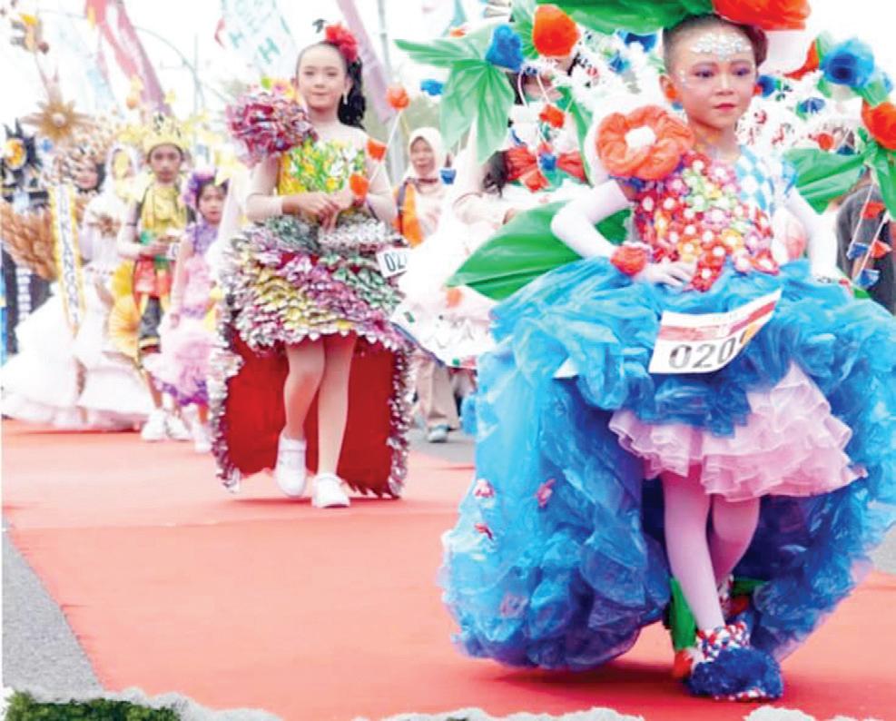 tik, daun dan kertas bekas. Para peserta fashion show daur ulang ini terdiri dari para siswa SD/MI, SMP/ MTs, SMA/MA, hingga umum. Ribuan peserta tersebut menampilkan karyanya di atas karpet merah yang disediakan. Meskipun kegiatan berjalan hingga siang hari, terik matahari tak men-