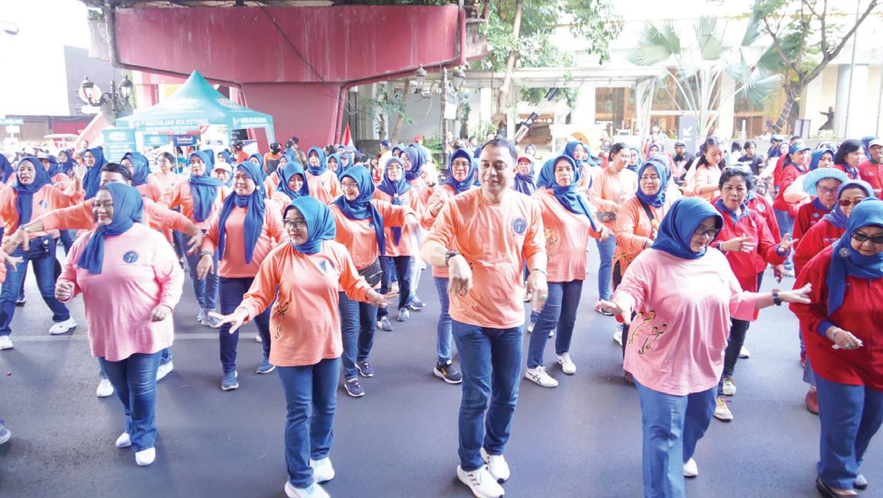 Wali Kota Surabaya Eri Cahyadi saat mengikuti kegiatan bertajuk “Line Dance Bareng Nang Tunjungan” dalam rangka memeriahkan HJKS ke-731.