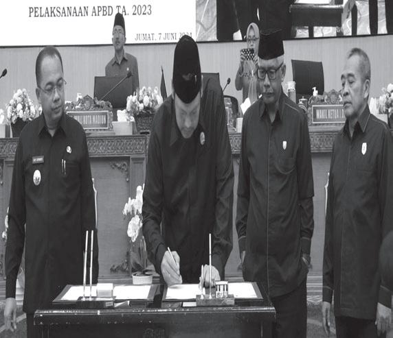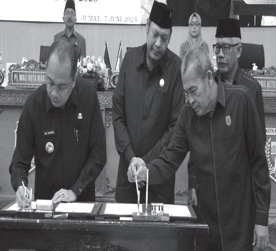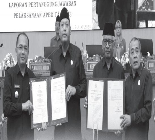 Rapat Paripurna Pengambilan Keputusan yang didahului Penyampaian Pendapat Akhir (PA) Fraksi-Fraksi DPRD Kota Madiun Atas Raperda Tentang Laporan Pertanggunjawaban (LPJ) Pelaksanaan APBD TA 2023 dilanjutkan penandatanganan bersama antara Pimpinan DPRD Kota Madiun dan Pj. Wali Kota Madiun di gedung DPRD setempat Jumat (7/6). Sidang Paripurna itu dipimpin oleh Ketua DPRD Kota Madiun Andi Raya Bagus Miko Saputra, SH didampingi Wakil Ketua I, II DPRD Kota Madiun, Drs. Istono, M.Pd dan Drs. H. Armaya. Hadir pula Pj. Wali Kota Madiun, Eddy Supriyanto, Forkopimda, Sekda Kota Madiun serta para Kepala OPD, Camat dan undangan lainnya. Dalam Pengambilan Keputusan bersama antara Pimpinan DPRD Kota Madiun dan Pj. Wali Kota Madiun, setelah sebelumnya ketujuh Fraksi DPRD Kota Madiun telah memberikan catatan, saran dan pendapat untuk mendapat jawaban dari PJ Wali Kota Madiun. Ke tujuh Fraksi yakni Fraksi PDI Perjuangan jubir Widodo Poncoputro, S.Sos. M.Si, Fraksi Partai Demokrat jubir Drs. H. Sugeng, SH. MH, Fraksi PKB jubir H. Agus Wiyono, SH, Fraksi Perindo jubir Drs. H. Armaya, Fraksi Gerindra jubir Rina Haryati, ST. MM, Fraksi PSI – Nasdem jubir Tutik Endang Sri Wahyuni dan Fraksi PKS-PAN jubir Drs. Subyantara dalam Pendapat Akhirnya menerima dan menyetujui Raperda Tentang LPJ Pelaksanaan APBD TA 2023 ditetapkan menjadi Perda. Ketua DPRD Kota Madiun, Andi Raya BMS, SH, sekaligus pimpinan rapat mengatakan bahwa sikap kritis proposional yang diambil oleh DPRD ini diharapakan dapat