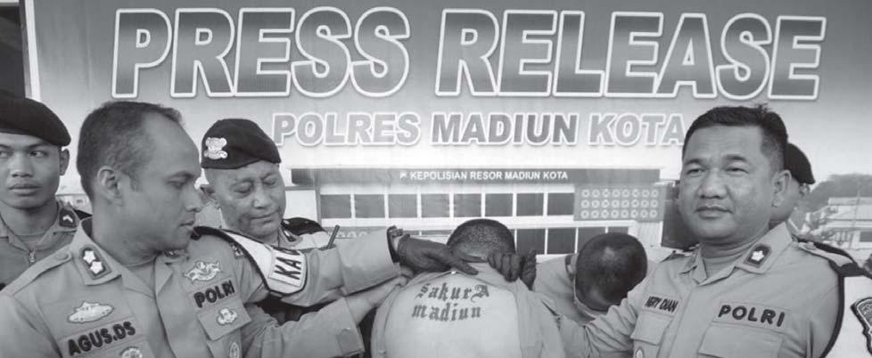 dewasa kami tahan sesuai aturan yang berlaku. Sehingga, dari 11 tersangka ini 9 orang tidak ditahan dan dua lainnya ditahan,’’kata Kapolres Madiun Kota AKBP Agus Dwi Suryanto kepada awak media saat press release di Mapolres Madiun Kota, Rabu (5/6). Kesempatan itu, Kapolres Madiun Kota, AKBP Agus Dwi Suryanto memaparkan kronologi kejadian. Menurut hasil penyelidikan polresta, aksi pengeroyokan dan pengrusakan bermula dari komunitas Satuan Khusus Raja Tega (Sakura) yang mengadakan ulang tahun ke-4 di salah satu kafe di Jalan Yos Sudarso.
