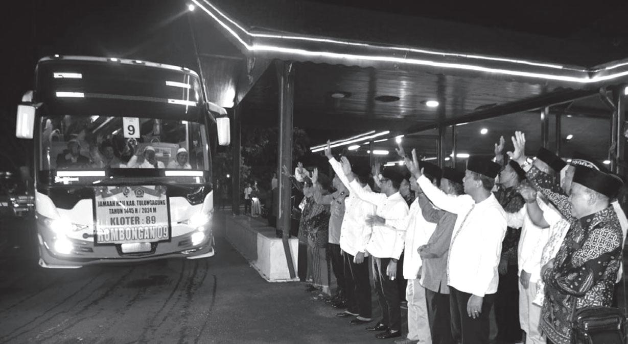 oordinasi dengan panitia yang ada di Arab Saudi,” paparnya. Jemaah calon haji Kabupaten Tulungagung seluruhnya berjumlah 1.200 jemaah. Mereka diberangkatkan menuju asrama haji di Surabaya dengan dua gelombang atau dua tahap. Pelepasan rombongan pertama yang mengendarai 27 bus dilakukan pada Selasa (4/6) pukul 23.00 WIB. Dan yang kedua, dengan tiga bus pada Rabu (5/6) pukul 16.00 WIB. Rombongan pertama merupakan kelompok terbang (kloter) 89, 90 dan 91. Sedang rombongan kedua tergabung dalam kloter 92.n [wed.dre]
