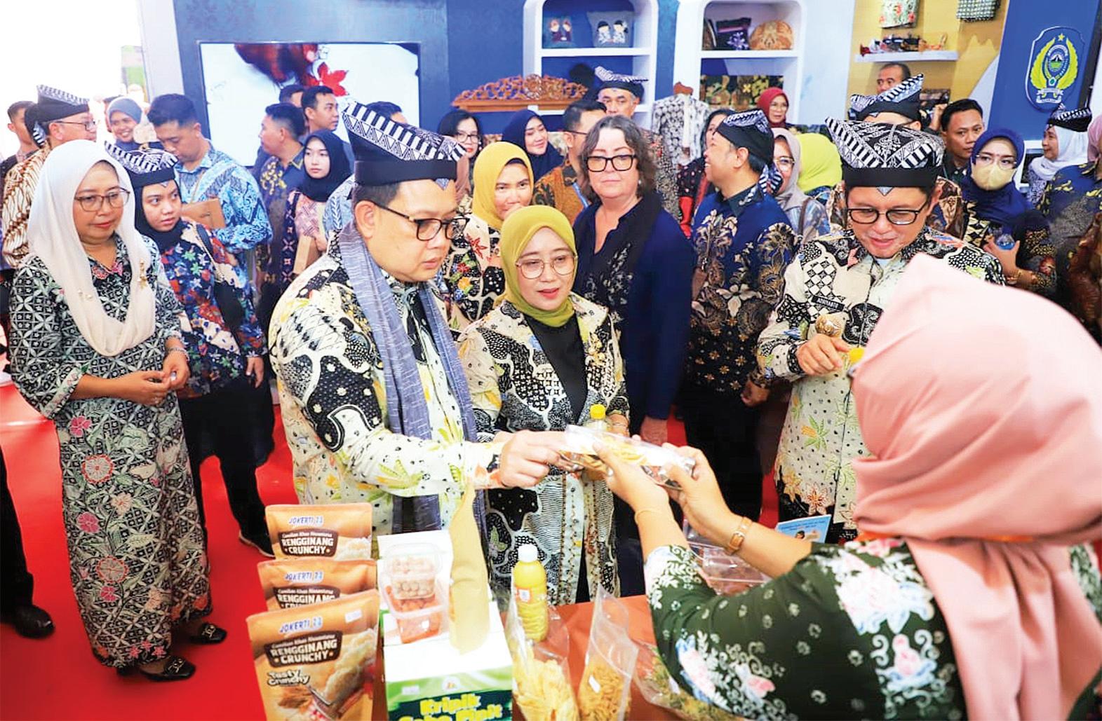 Penjabat (Pj) Gubernur Jatim Adhy Karyono menyaksikan langsung kemeriahan Pekan Batik Daerah Budaya Bangsa di Alun-Alun Kabupaten Bojonegoro, Rabu (5/6). Pameran besutan Dekranasda Bojonegoro itu mengusung tema “Batikku Batikmu Batik Kita