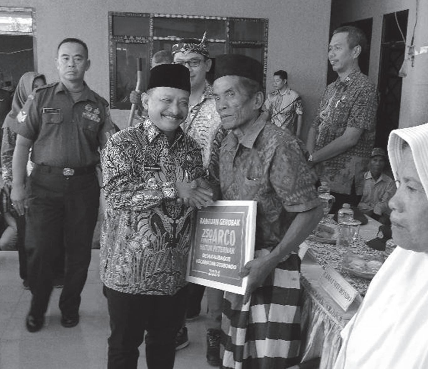 Situbondo, Bhirawa Sedikitnya ada 250 peternak sapi di Desa Kalibagor, Kecamatan/Kabupaten Situbondo mendapatkan bantuan arco. Bantuan tersebut diserahkan langsung oleh Bupati Situbondo, Karna Suswandi di balai desa setempat, Kamis (6/6). Bupati Karna Suswandi mengatakan, bantuan arco tersebut diharapkan dapat meringankan pekerjaan para peternak sapi yang ada di Desa Kalibagor, terutama saat membersihkan kandang.