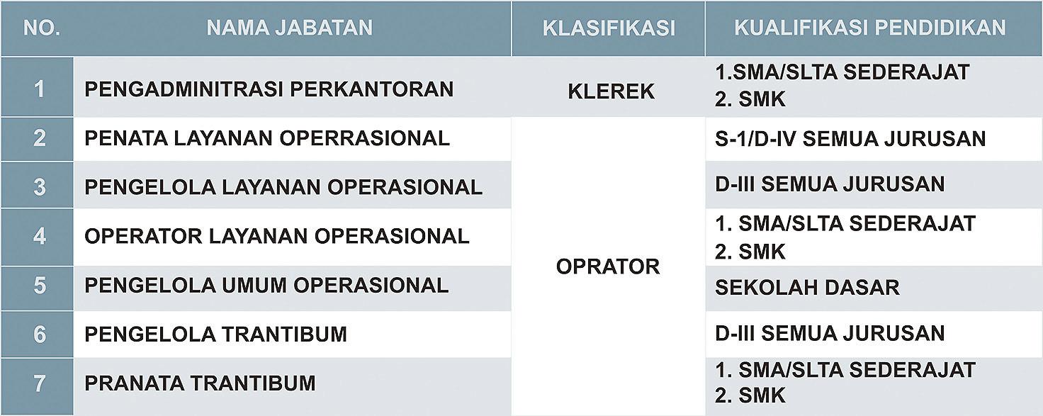 Terkait hal itu, BKD Jatim telah mengklasifikasikan tujuh jenis jabatan berdasarkan kuakifikasi pendidikan. Di antaranya ialah pengadministrasian perkantoran untuk lulusan SMA/ SMK se derajat, penata layanan operasional