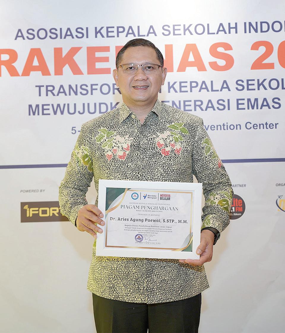 Dindik Jatim, Bhirawa Kepala Dinas Pendidikan Provinsi Jawa Timur, Aries Agung Paewai, menerima penghargaan sebagai Tokoh Inspiratif Provinsi kategori Peraih Prestasi Terbaik. Penghargaan membanggakan ini diberikan Asosiasi Kepala Sekolah Indonesia (AKSI) saat melaksanakan Rapat Kerja Nasional di Trans Convention Center, Kota Bandung, Rabu (5/6) malam. Atas capaiannya, Aries mengucapkan terima kasih atas penghargaan yang diberikan. Penghargaan