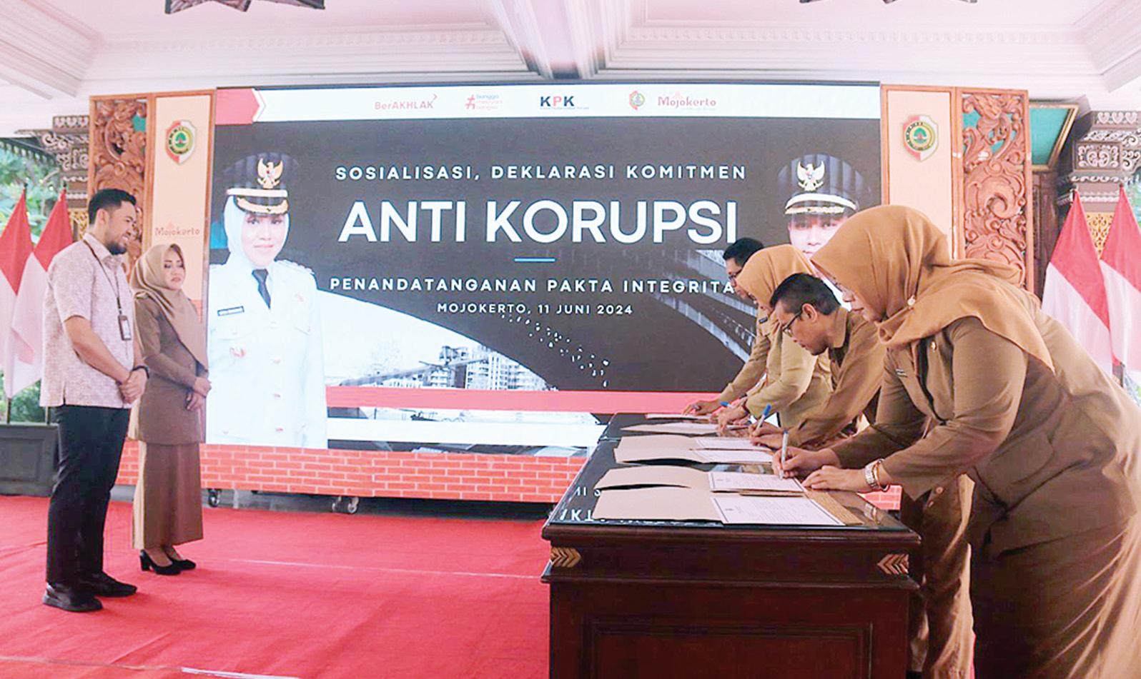 Mojokerto, Bhirawa Bupati Mojokerto, Ikfina menegaskan penandatanganan pakta integritas dilakukan untuk mencegah potensi tindak pidana korupsi. Bagi pejabat yang terjerat kasus korupsi, pakta integritas akan menjadi pemberat hukuman.