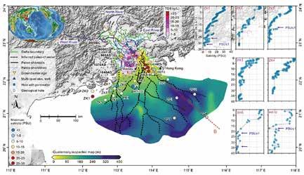 珠江口到大陸架之間海底古三角洲分布圖。其中相對淡水(鹽度小於10 g/L)分布廣 泛。鹽度曲線表明,在海裡以下40米的地層中的孔隙水的鹽度可低至1 g/L)。