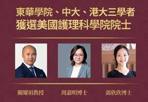 東華學院護理學院副院長關耀祖教授、香港中文大學醫學院助理院長周嘉明博士、香港大學 護理學院助理教授郭欣欣博士,膺選美國護理科學院院士。關耀祖教授加入東華學院前,曾 在香港理工大學護理學院服務逾十年。