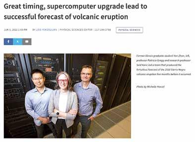 美國伊利諾伊大學關於成功預報加拉帕戈斯群島 Sierra Negra火山的新聞報道。附圖從左向右依次 為詹彥博士、Patricia Gregg教授和美國國家超級 計算應用中心的Seid Koric教授。