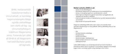Meðal verkefna BHM er að: • Styðja við starf aðildarfélaganna • Efla þekkingu félagsmanna og trúnaðarmanna á vinnumarkaðsréttindum • Semja um sameiginleg hagsmuna- og réttindamál skv. umboði • Gæta hagsmuna félagsmanna gagnvart stjórnvöldum og löggjafarvaldi, alla starfsævina að námsárum meðtöldum • Hafa frumkvæði að umræðu um háskólamenntun og stöðu háskólamenntaðra á vinnumarkaði • Eiga samstarf við systursamtök erlendis Félagsmenn aðildarfélaga BHM starfa á öllum sviðum vinnumarkaðar, flestir samkvæmt kjarasamningum en einnig sjálfstætt. BHM og aðildarfélög semja um kjör félagsmanna við: • Ríki • Samband íslenskra sveitarfélaga • Reykjavíkurborg • Samtök atvinnulífsins • Samtök fyrirtækja í velferðarþjónustu • Einstök fyrirtæki á almennum vinnumarkaði • Sjálfseignarstofnanir Í stefnu BHM kristallast sú sýn að blómlegt atvinnulíf sem horfir til framtíðar er forsenda fyrir bættum kjörum og réttindum á vinnumarkaði. Hagsæld á vinnumarkaði byggir á sterku menntastigi og góðri nýtingu þekkingar á öllum sviðum.