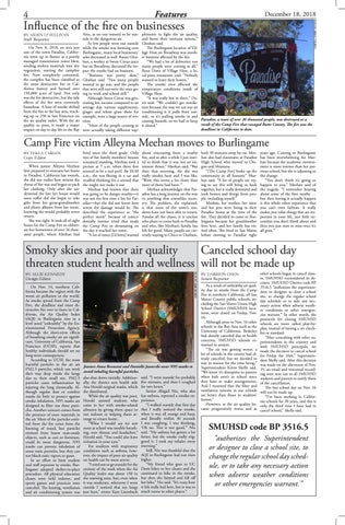 plements to fight the air quality, and boost their immune system,” Ghishan said. The Burlingame location of Village Host on Broadway was another business affected by the fire. “We had a lot of deliveries; not many people were coming at all,” Ryan Davis of Village Host, a local pizza restaurant, said. “Nobody wanted to leave their homes.” The smoke even affected the temperature conditions inside of Village Host. “It was really hot in there,” Davis said. “We couldn’t get ventilation because the way we use our air conditioning is it pulls from outside, so it’s pulling smoke in and causing hazards, so we had to keep Paradise, a town of over 26 thousand people, was destroyed as a result of the Camp Fire that ravaged Butte County. The fire was the it closed.” deadliest in California to date.