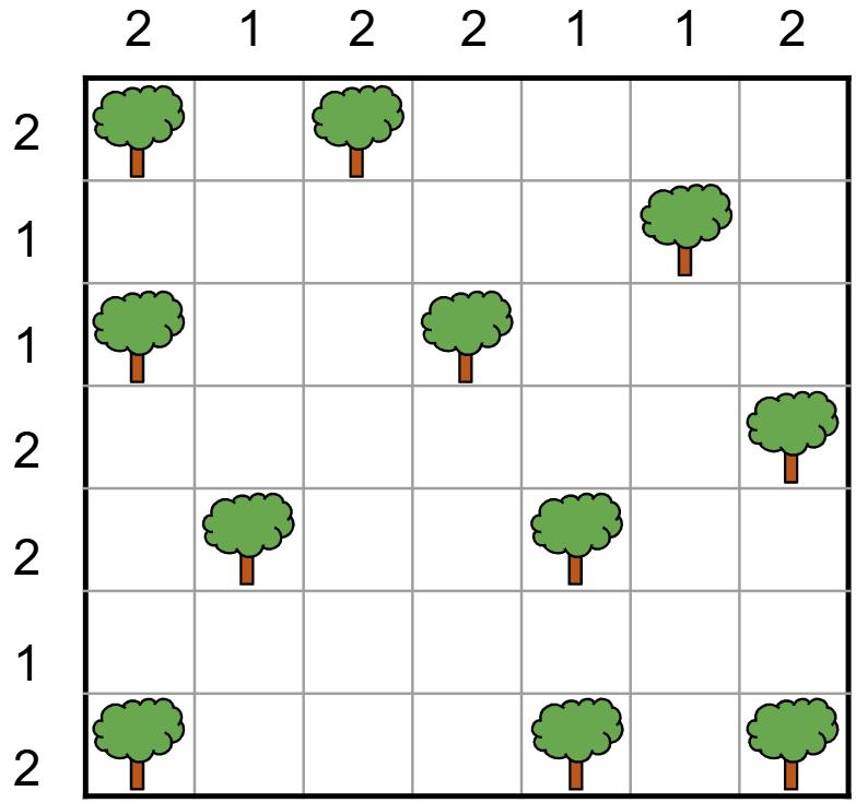 Rules: Draw one tent (triangle) next to every tree, horizontally or vertically — but not diagonally. There should be as many tents as there are trees. Tents should never touch, not even diagonally. The numbers outside the grid should match how many tents are in the respective row or column. (Ex: a column labelled 2 must have 2 tents in it.)