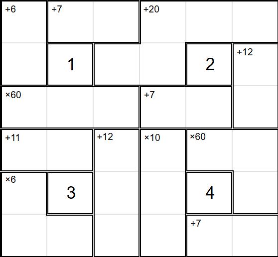 Rules: Each row and column contains the numbers 1 to 6 without repeats. Each set of bordered squares has a target number and an operation (multiply or add) in the top-left; the numbers in that region should evaluate to the clue number after the operation is applied. (Ex: 3, 4, and 6 could go into a region with the clue ×72, since 3 × 4 × 6 = 72; 3, 4, and 6 could also go into a region with the clue +13, since 3 + 4 + 6 = 13.)