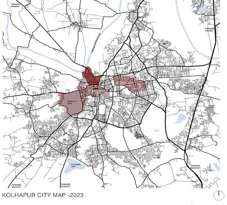The Bramhapuri hills, located close to the ghats, signify the early settlements in Kolhapur. The river is utilized for both religious rituals and everyday activities, and there are ample green spaces that can be utilized for recreational purposes. The Shivaji Bridge plays a vital role in connecting various cities, while the temples in the ghats, namely Jotiba and Mahalaxmi,serve as important stopovers for travelers. The settlements in the area have a transient character, with invisible religious boundaries based on caste divisions. The geographical location becomes the advantage if the site. Panchganga ghats and peth area have historically been divided into lanes based on following the Bara Occupations. The Shivaji market which lies in the vicinity of the KMC is a major centre for trade and commerce.