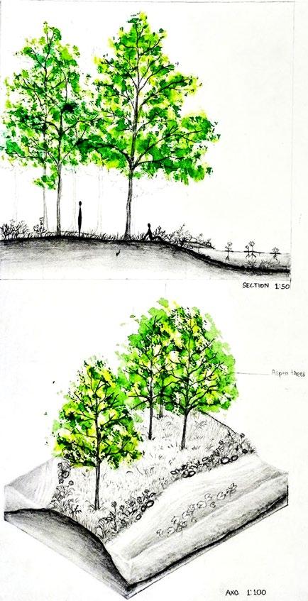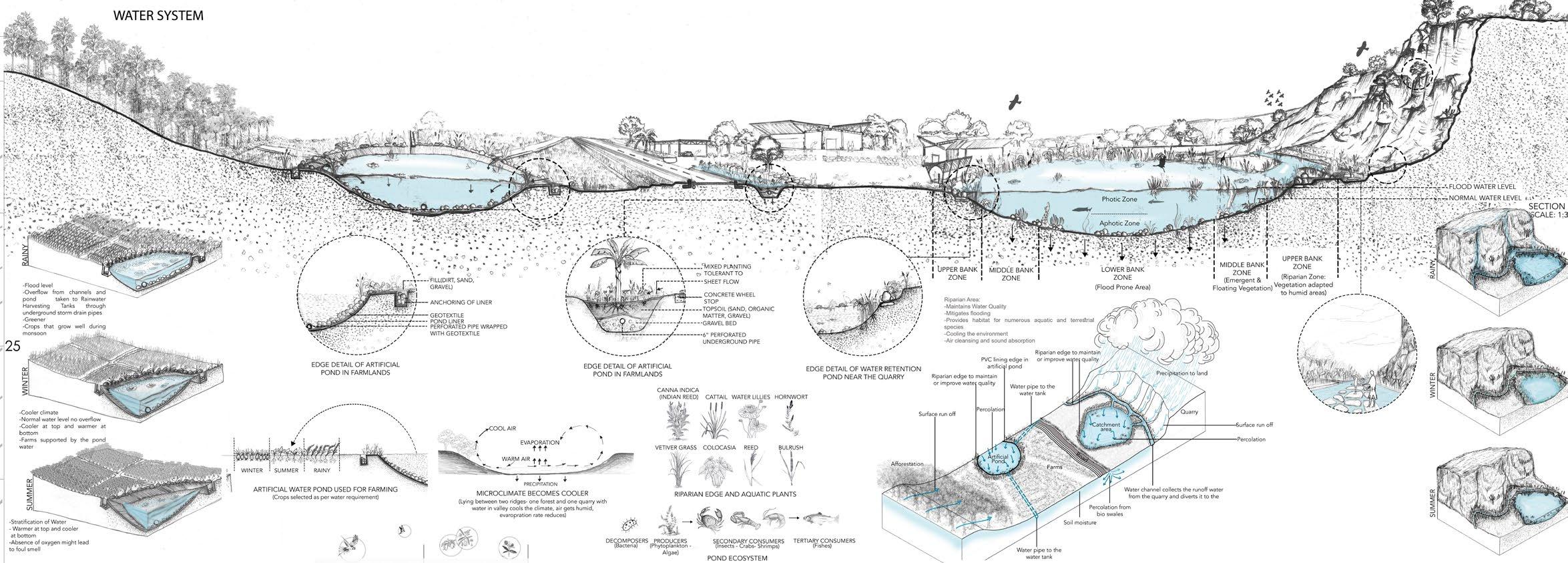 Few elements the microclimate design includes areWater retention pond, water channel with pavement along, bioswales, quarry garden, cowshed, market, dorm, parking, phytoremediation pit, poultry farm, terrace farming, shelter beds, trail to quarry top, solar panels, etc