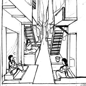 The character surveyed was a 48yr old self employed women in Shivaji nagar,does stitching at home and is not much socially active. The design process was driven by the interactions and understanding of spaces used by the character and social context . It started with idea of open plan, good ventilated and naturally illuminated spaces. Together a space where they craft a secure and vibrant learning-living habitat, that is focused on enhancing interactive spaces and use of shared spaces. The design emerges from a fusion of exposed brick building with jaali walls and steel & shear wall structure . It has 2 significant tall shear wall at both entrances. The north facade has large openings and east face comprises of jaali walls for filtered light. The main idea was to have a homely feeling yet openness in contrast to their current living condition context , to achieve that structure ,steel columns and using shear walls and brick walls for dividing spaces according to program the layout has 2 main courtyards with other open spaces and double height space. For good environment landscaping is done around the building with some existing vegetation.
