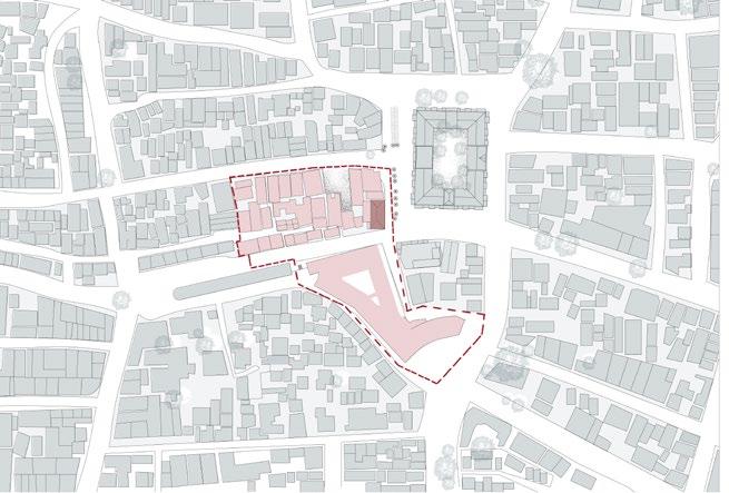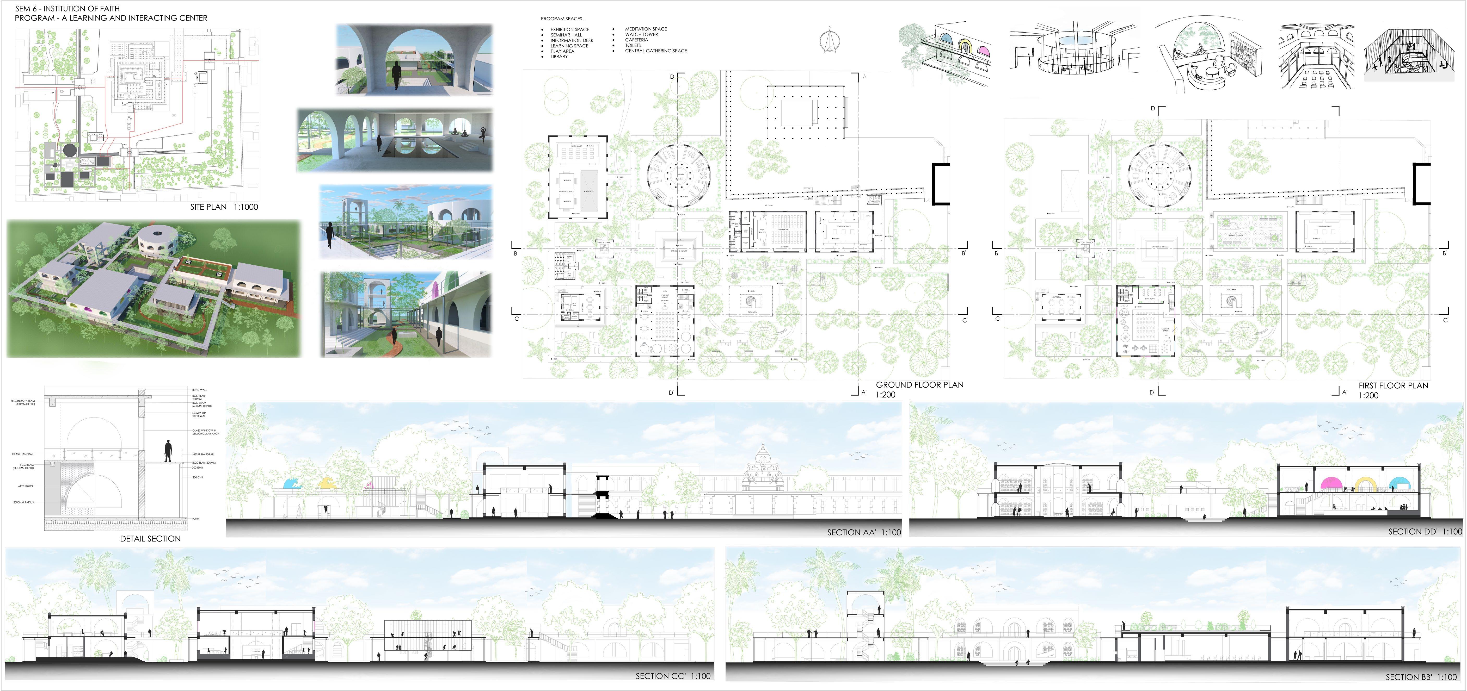 The design is aimed to create a learning and peaceful space for visitors to interact ,learn about morals,art,temple history,life,etc.A place away from the hustle and bustle of city life. It is merged with temple part to blend with existing circulation .Instead of concentrating the program in a single, large-scale volume, the building evokes the idea of a community and is organized in six main blocks that are of different proportion .Common opening at first floor level connected to pathways.