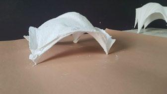 SHELL MODEL- Using Heinz Isler’s method of model making for desiging shell structures. A piece of cloth that is hung from several fixed points will create an ideal form that is completely in tension. If the shape is “frozen” and flipped, the resulting shell should be in complete compression. Observed these naturally formed shells could be “wafer-thin and still resistant’’.