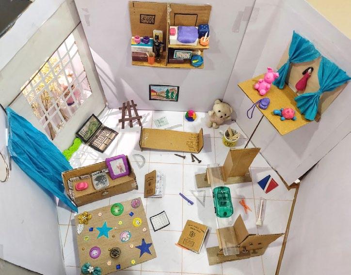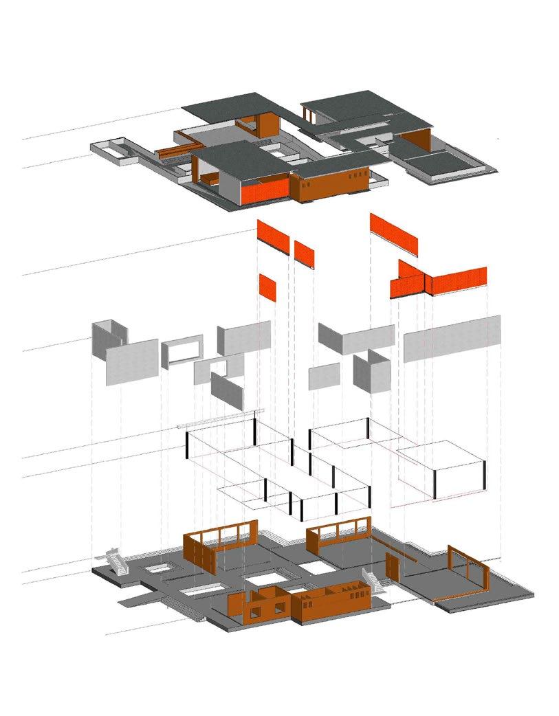 Parapet Flat Concrete slab Brick jaali walls Conc. Shear walls ISMB 250 CHS 300 Brick wall Kota tile flooring Conc. half landing staircase SITE PLAN EXPERIENCE EXPLODED AXONOMETRIC VIEW CONCEPT / PROGRAM context It started with idea of open plan, good ventilated and naturally illuminated spaces. Together a space where they craft a secure and vibrant learning-living habitat that is focused on enhancing interactive spaces and use of shared spaces. The design emerges from a fusion of exposed brick building with jaali walls and steel & shear wall structure It has 2 significant tall shear wall at both entrances. The north facade has large openings and east face comprises of jaali walls for filtered light The main idea was to have a homely feeling yet openness in contrast to their current living condition context to achieve that structure ,steel columns and using shear walls and brick walls for dividing spaces according to program the layout had 2 main courtyards with other open spaces and double height space. For good environment landscaping is done around the building with some existing vegetation