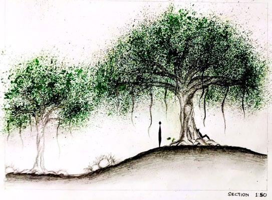 Pathways composed of imposing stone elements, integrated with dense shrubbery, leading you towards an undulating landscape. This journey requires you to climb on slope through the twisting roots of majestic Banyan trees, creating a captivating experience. As you find respite beneath the expansive foliage, nestled near the prominent roots. This design aims to evoke a deep connection with the magnificence and scale of the nature, humbling us in our own smallness.