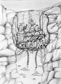 INVISBLE CITY OCTAVIA - Octavia is described by Italo Calvino (1974) in his book Invisible Cities as the spider-web city, it is a city hanging over the void between two mountains. The infrastructure that holds the city together is made of ropes, chains, and catwalks. The task was to interprete idea of the city by making sketches,drawing and model making using household materials.