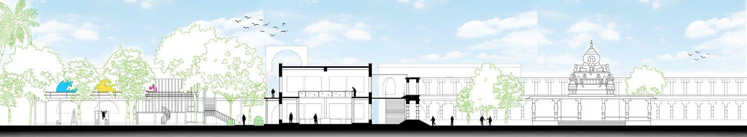 Oblique - Fill every beat with something. Filling an edge of the Natraja temple complex, years ago for further expansion.Filling with different types of learning and interacting spaces , with visitors acting like various beats, engaging with unusual non- vernacular architecture. Spaces connected with raised pathways filled with plants and trees providing a natural shed and help in enhancing the existing vegetation.Design has arches as a hook element in beats creating a rhythmic movement.