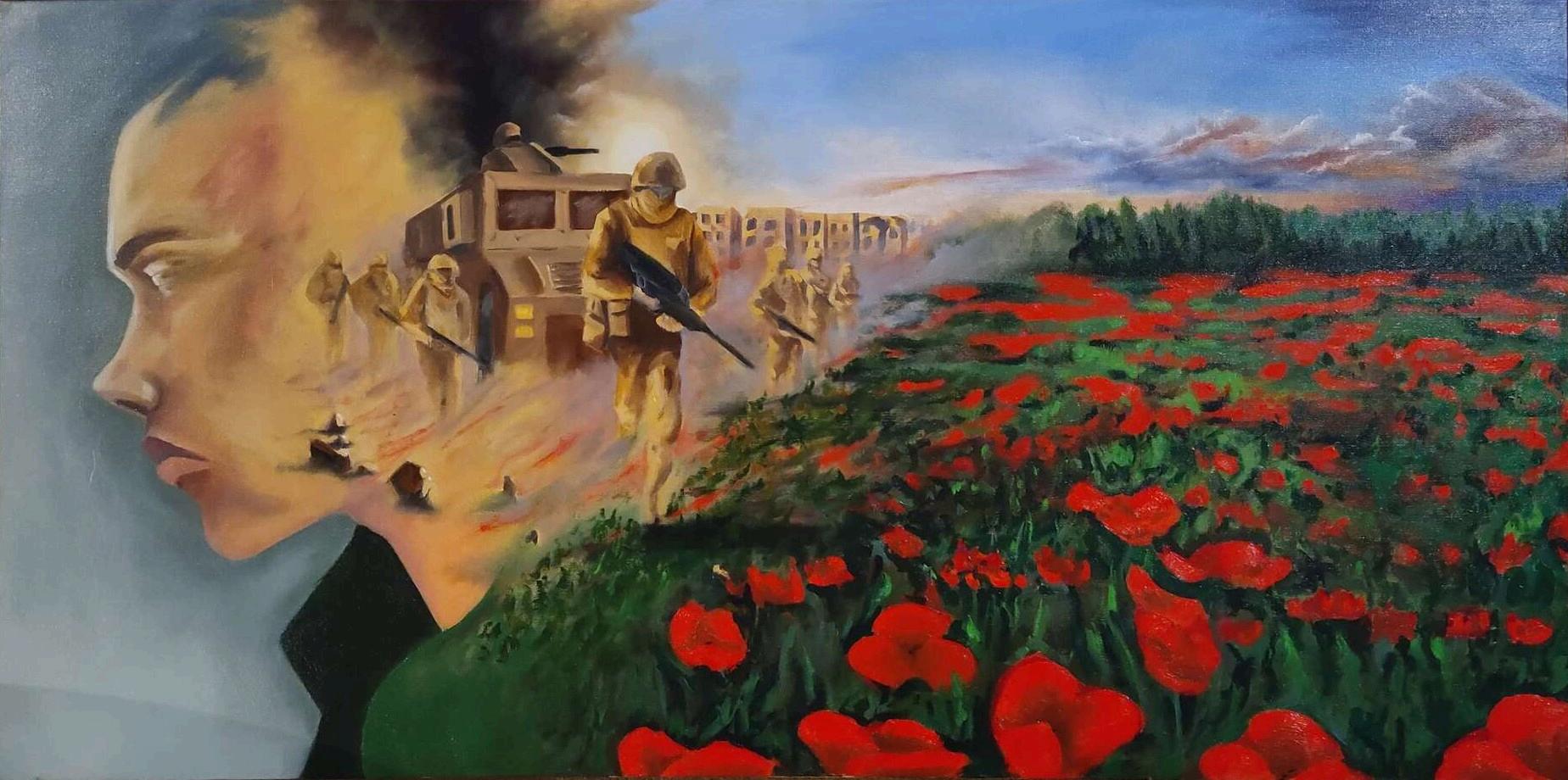 W:36 H:24 in 2023 Oilpaintingdepictingayoungsoldierre ectingonwarandpeace